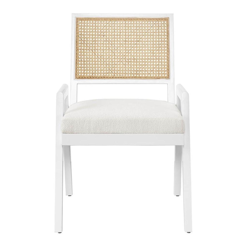 The Cane Back Arm Chair brings subtle bohemian vibes to home interiors with its striking pairing of materials, including a woven cane back, a crisp white body and a plush upholstered seat cushion.