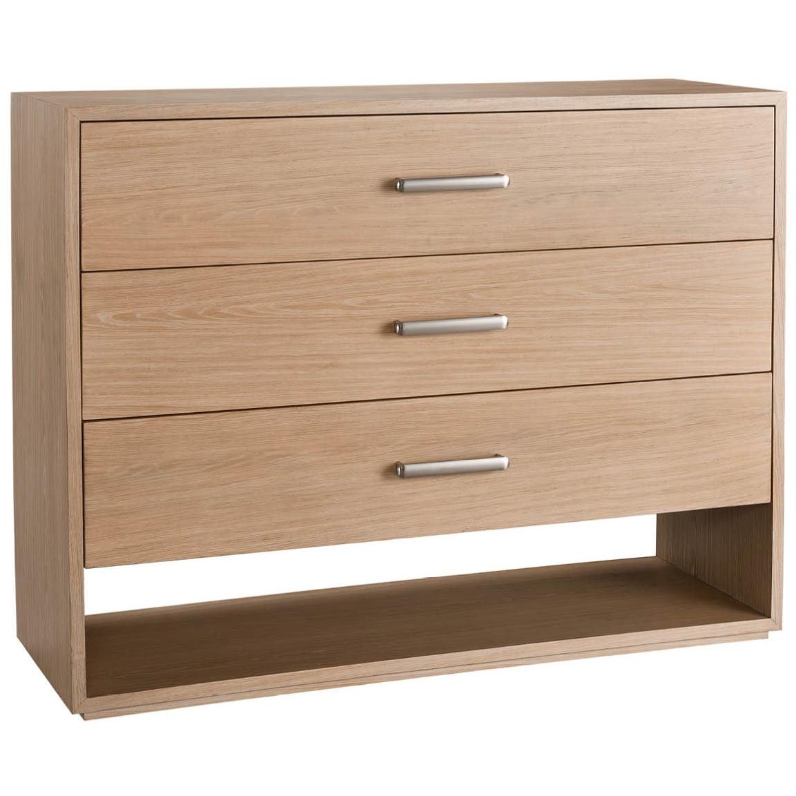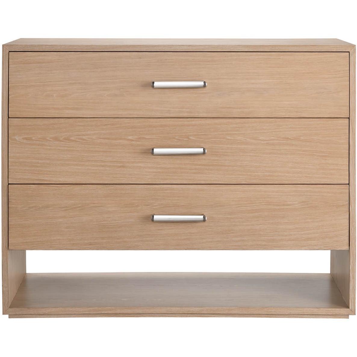 The Single Dresser will accentuate bedroom areas with both style and function, featuring three spacious drawers, a lower open-air shelf, and a dynamic pairing of an oak finish and modern bar hardware.