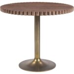 The wave detailing on the Nomi cafe table is a visual highlight, an expression of the thoughtfulness and attention to detail that went into its design, adding a sense of dynamic movement. The repetition of the wave pattern creates an inviting rhythm, providing a memorable visual experience along with a brass base, nodding to vintage design while maintaining a contemporary refinement, together conveying a sense of future heirloom quality.