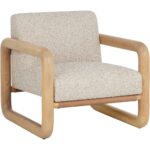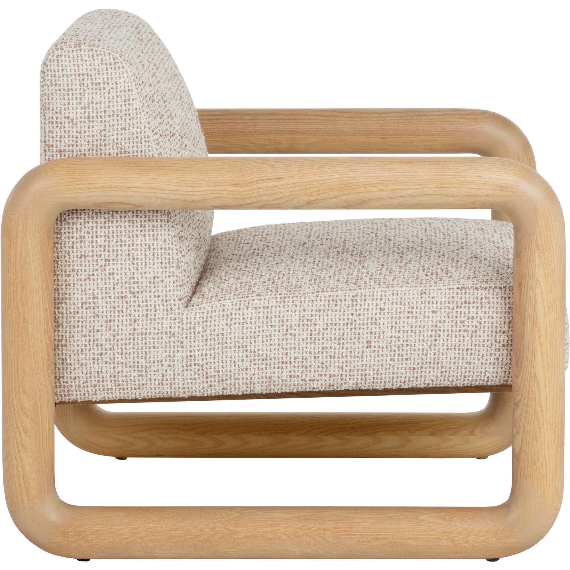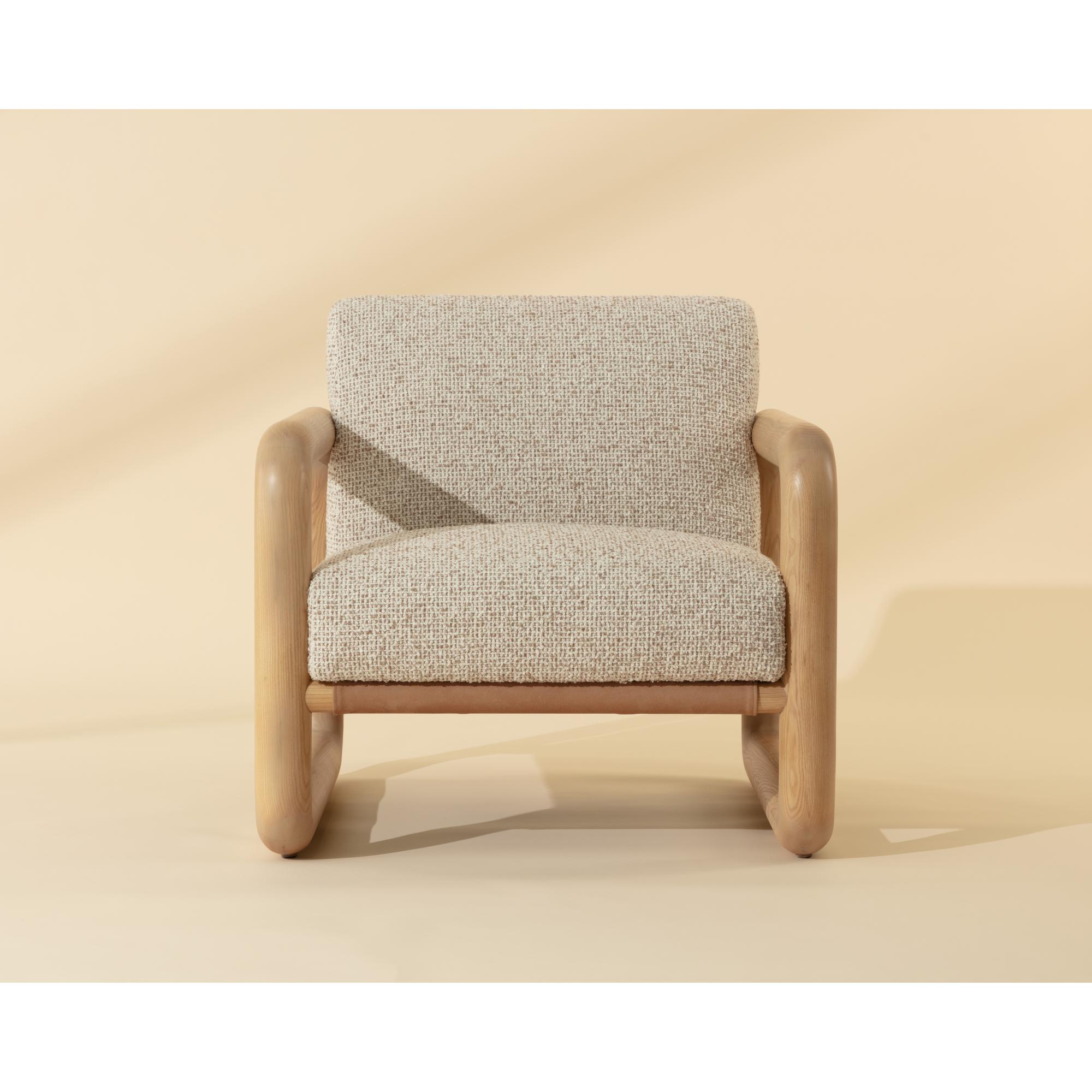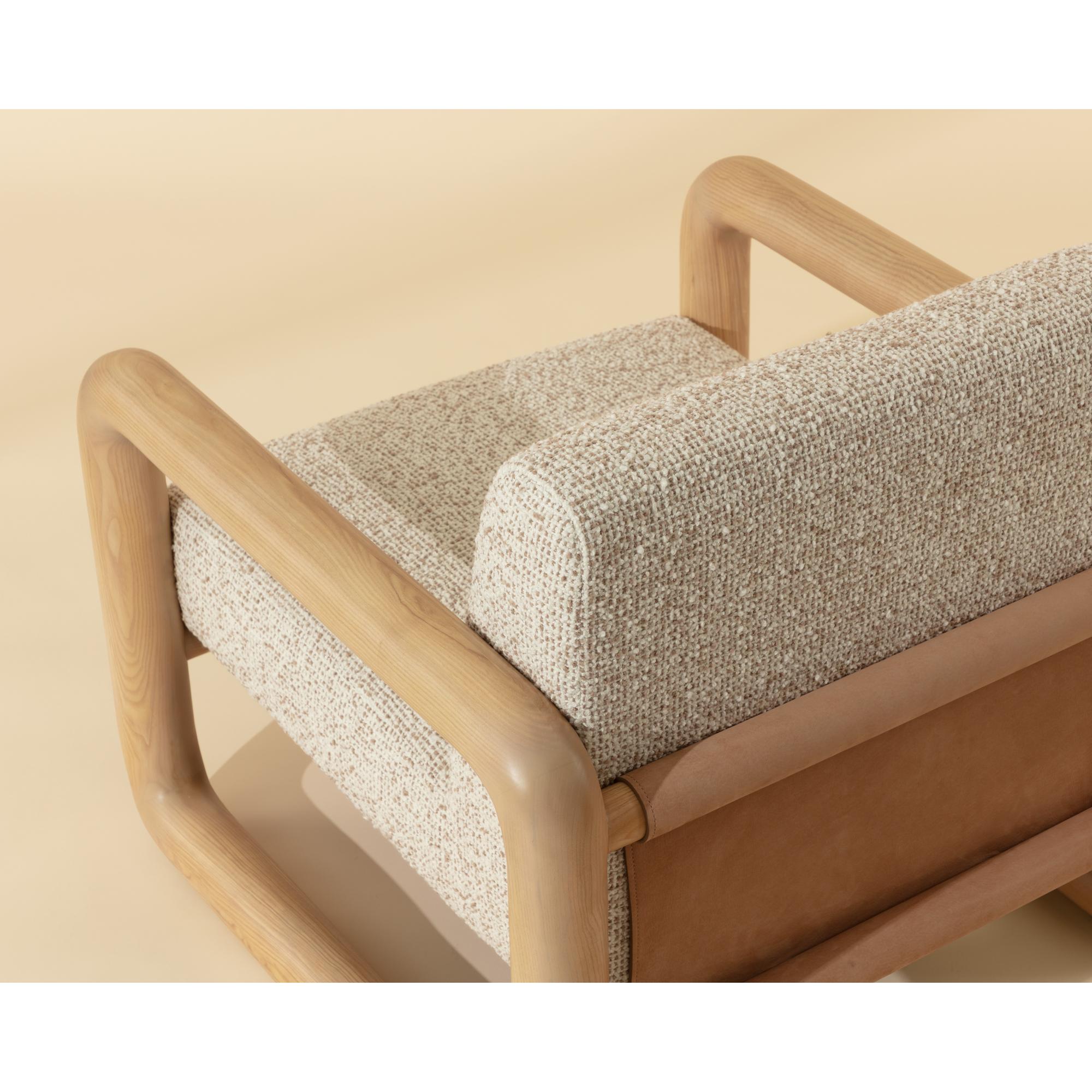 The Nubo Lounge Chair is made for moments of pause. Its solid ash wood frame flows in a continuos loop with soft, radiused corners. A broad seat upholstered in textured noah ecru fabric feels generous and inviting, while panels of nubuck tan leather stretch across the back and base, adding a tactile contrast that gives the chair its relaxed character.