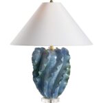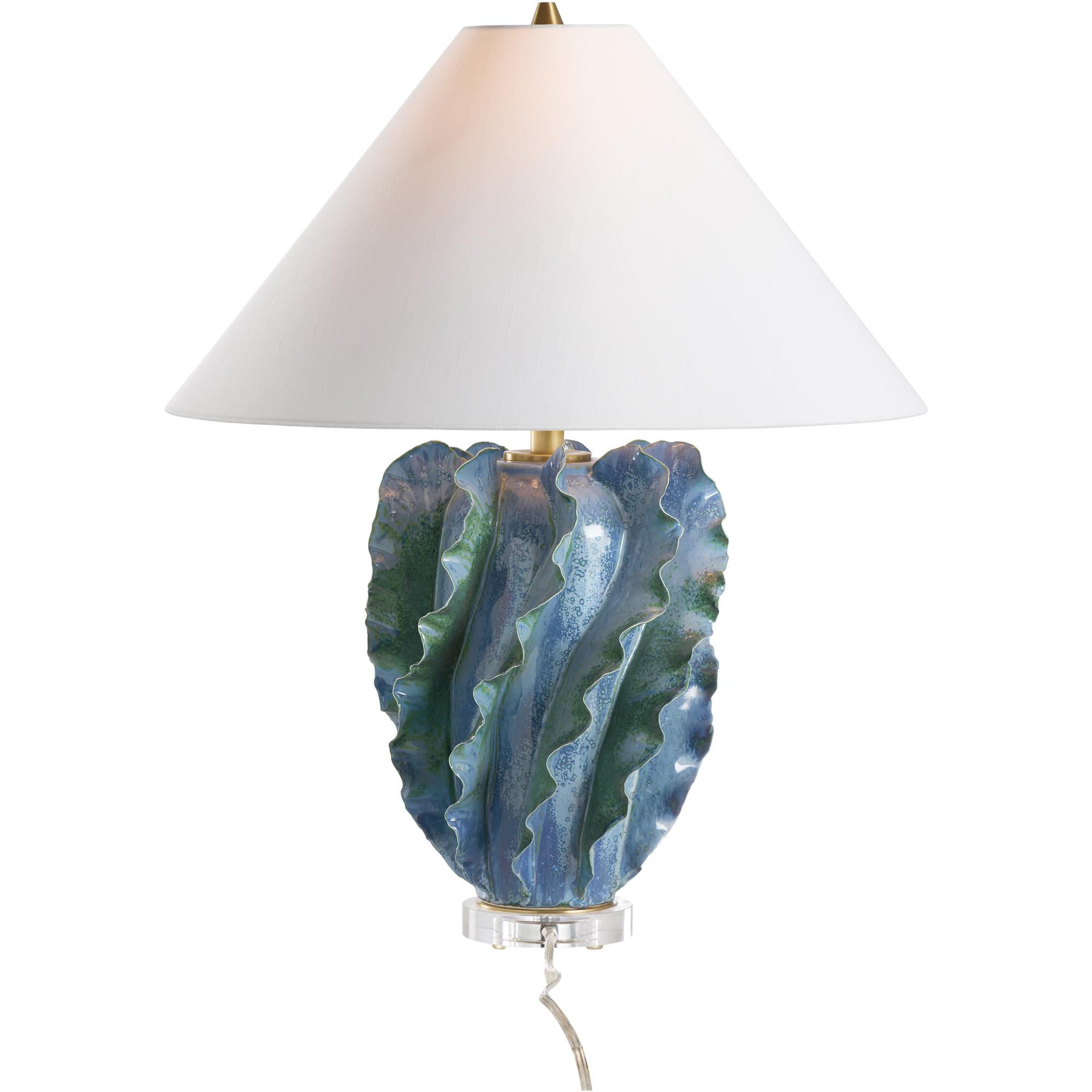 This ceramic lamp features soothing shades of blue and green, blending together like ocean tides. Its surface is adorned with scalloped protrusions reminiscent of gentle waves, adding texture and movement to the design. A clear base provides a modern, airy contrast, grounding the piece while keeping the focus on its unique and beautiful form.