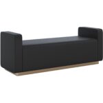 Boasting a chic block design, this modern bench features a minimalist design with high impact. Upholstered in ernst silverstone fabric with channel tufting. Completed with a striking antique brass stainless steel base. Also available in maven black faux leather.
