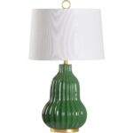 Introduce a touch of refined elegance to your home with our Oliver Lamp. Featuring a beautifully contoured ceramic body, the lamp showcases a rich, glossy parrot green glaze that brings a vibrant pop of color to any decor. The base’s fluted design adds texture and depth, making it an eye-catching focal point. Topping the lamp is a classic white drum shade, offering a soft, diffused light that creates a warm and inviting atmosphere. The lamp is accented with a gold leaf base, which provide a luxurious contrast to the deep green ceramic, enhancing its sophisticated appeal.