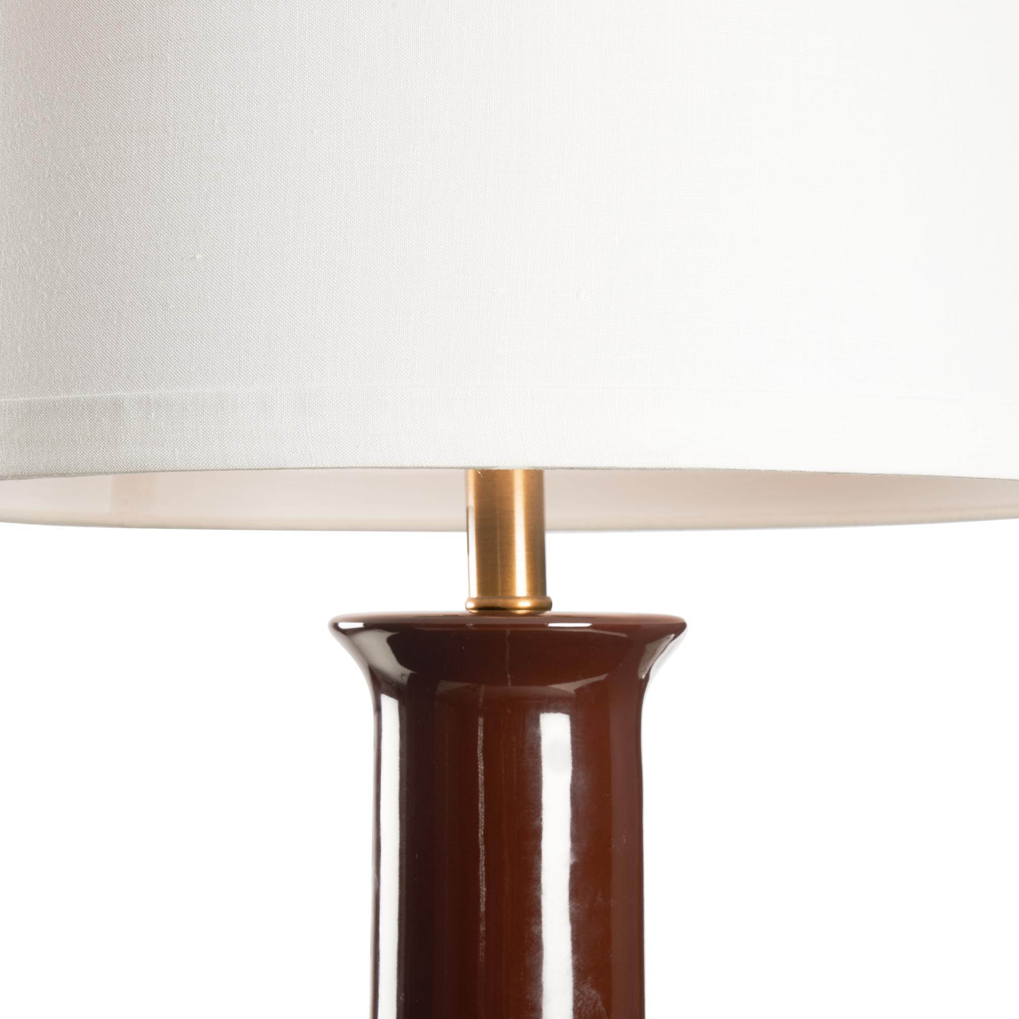 Refresh your home with the Olsen Lamp. This transitional design features an aubergine glazed ceramic vase with a classic silhouette. An antique brass mounting and ivory linen drum shade bring elegance to this timeless look. Display on tabletops throughout your home for a light source that blends effortlessly with any style.