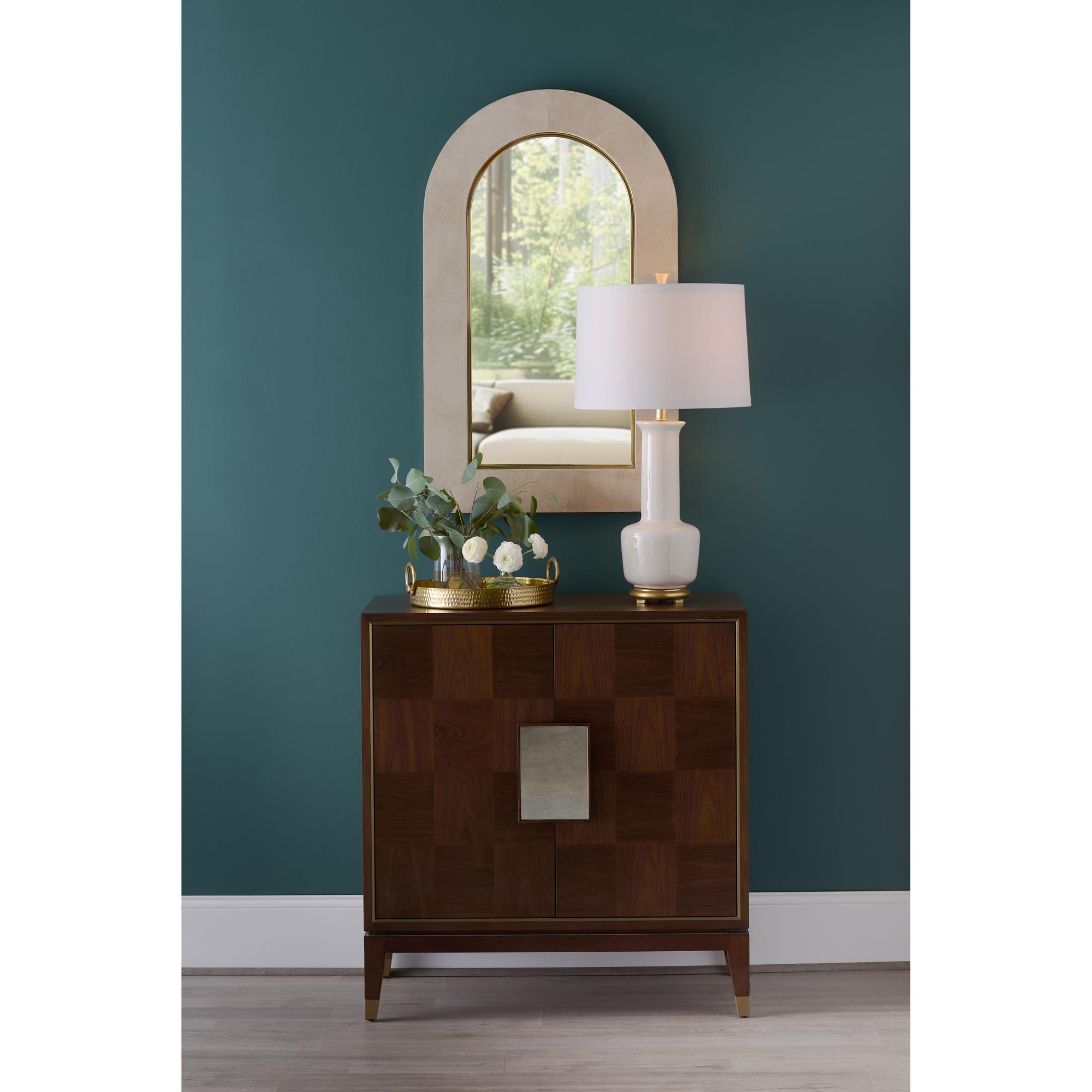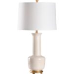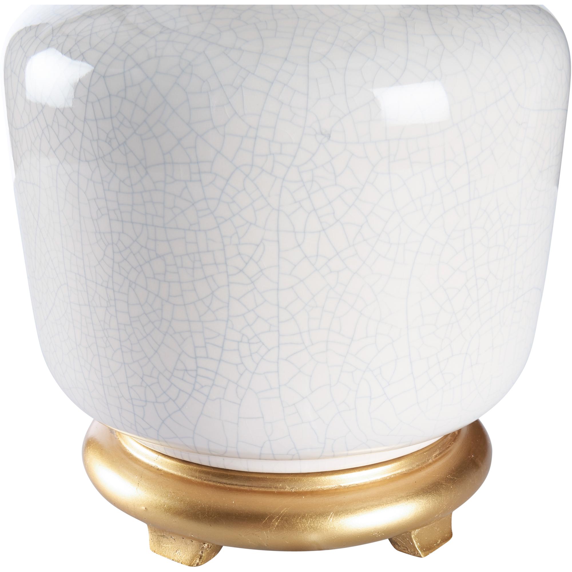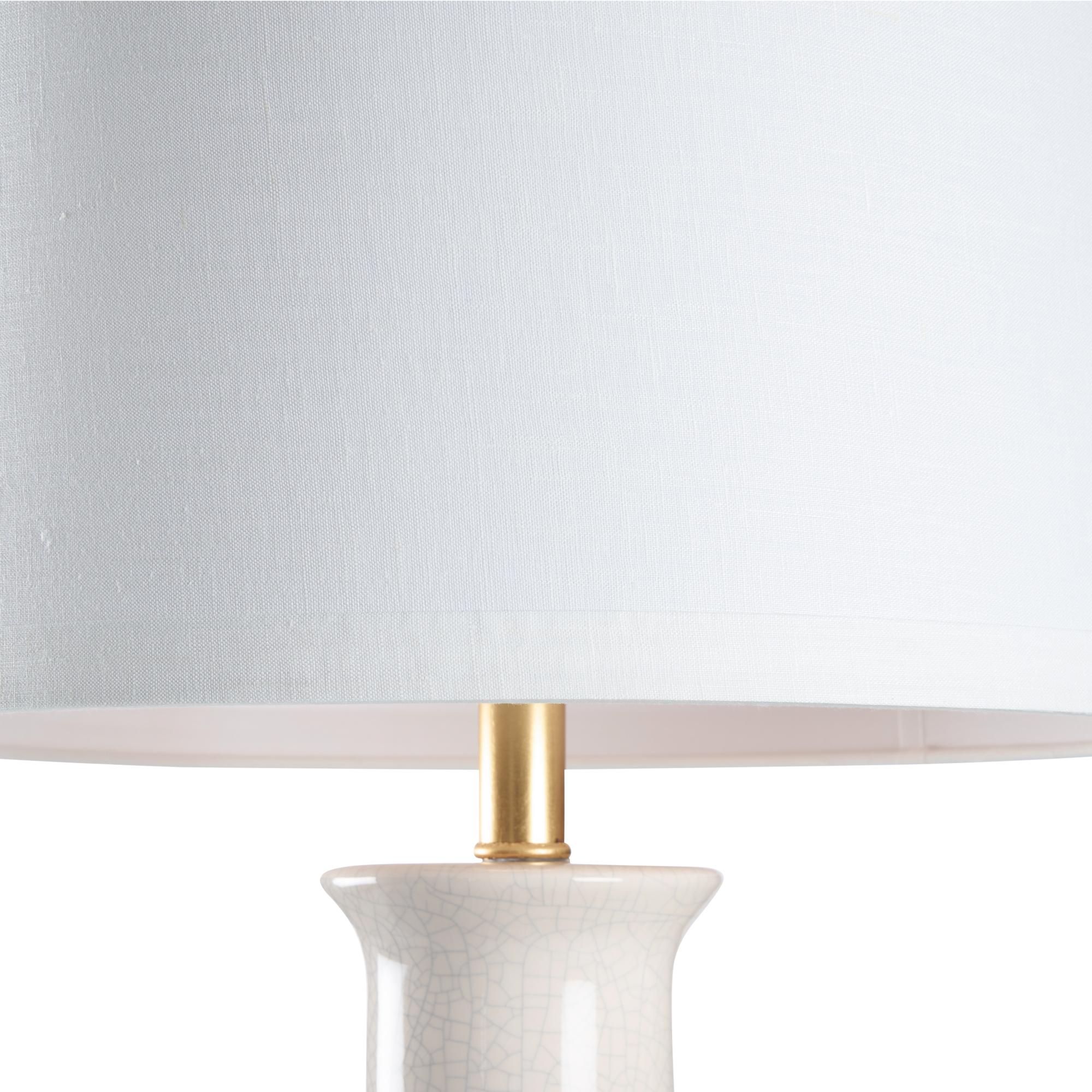 Refresh your home with our Olsen Lamp. This transitional design features a snow white glazed ceramic vase with a classic silhouette. An antique gold leaf mounting and ivory linen drum shade bring elegance to this timeless look. Display on tabletops throughout your home for a light source that blends effortlessly with any style.