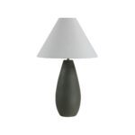 Embrace the earthenware trend with the stunning Oslo table lamp. Crafted with a healthy dose of drama, this light features a hand thrown ceramic base with a dark olive wash that highlights its beautiful texture and shape. In sharp contrast to the richly hued base is a smooth off-white linen shade with a clean-lined tapered form. A metallic touch is delivered by its champagne plated socket that holds an included bulb letting this lamp be turned on the minute it finds its new home. As far as bedroom table lamps or living room table lamps, go, this one is an incredible choice to instantly brighten up any room.