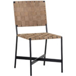 This elevated dining chair offers comfortable seating and unique style. Features a weaved seat in light tan suede leather and finished with a black iron frame.