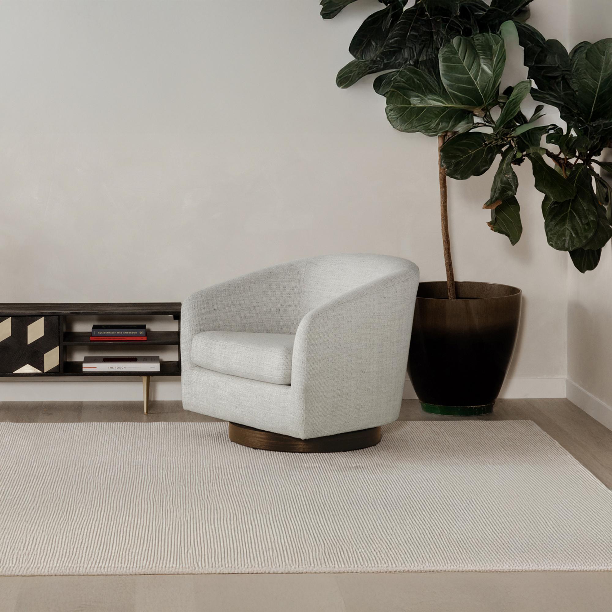 Light and cheerful. Calm and relaxed. The Oscy swivel chair is a cloud of comfort that brings airy energy and convenience into your living room with its 360° swivel, floating base design. Idyllic for a reading nook or as an accent chair, Oscy creates a chic retreat with softly textured fabric upholstery that looks fresh and keeps things cozy.
