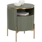 This luxurious end table will bring a sculptural spirit to any space. The round frame, finished in sage green, is contrasted with intricate vertical reeding. Gold stainless steel legs and inlay create added definition. Coordinating sideboard also available.