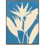 The Paradis framed painting captures the vibrant essence of the bird of paradise flower through its expressive shape and bold angular form. Set against a solid, rich blue background, the artwork’s textured paintwork creates a striking inverse silhouette, where bright light plays the defining role instead of dark shadow.
