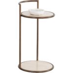 The curved minimalist design of the Parga End Table makes it a versatile accent for any space. Beautiful shelves with a travertine look elevate the overall look of the piece.