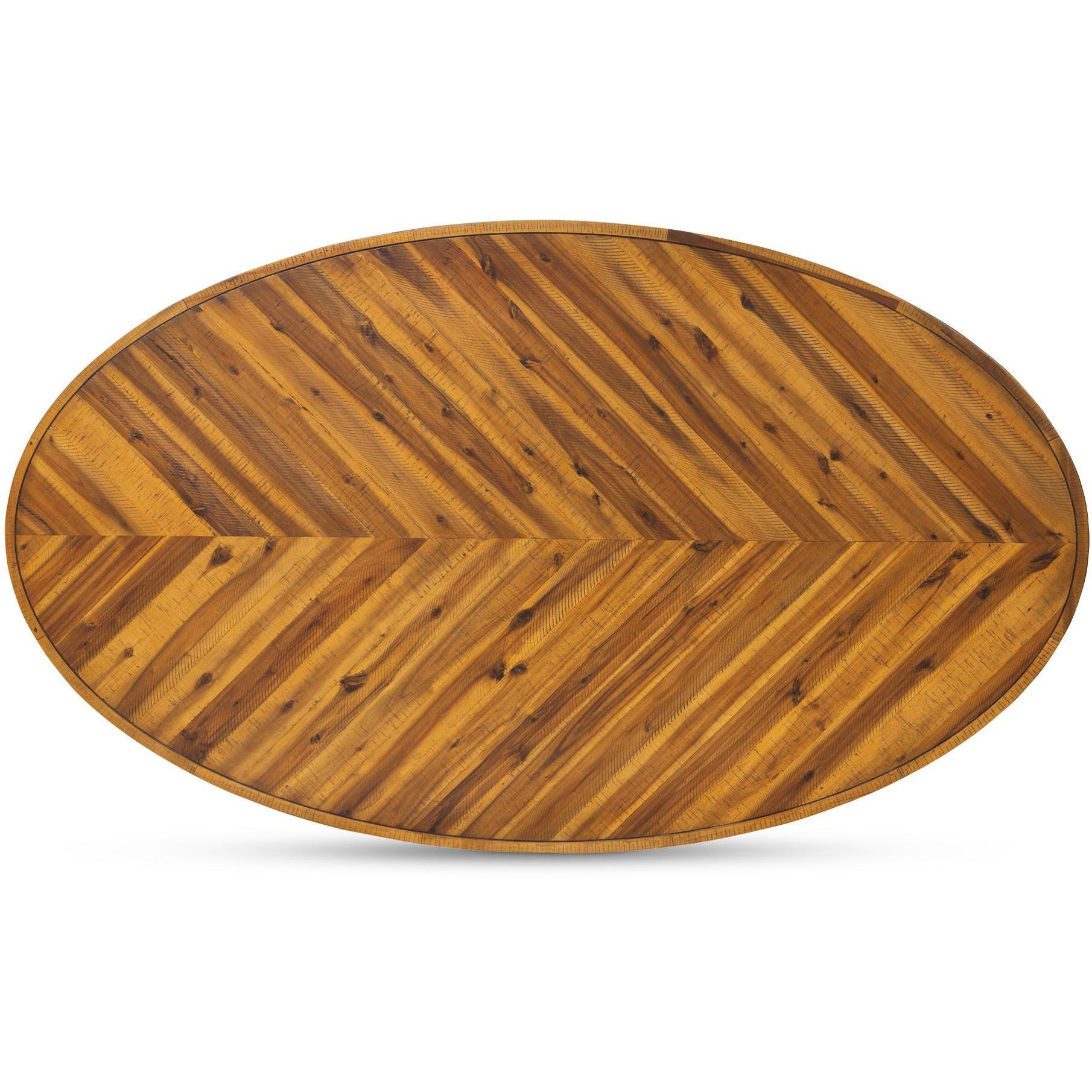 A hand-crafted piece of oval acacia wood rests on top black painted legs to give this dining table a modern yet rustic chic.