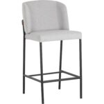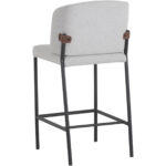 With a clean cut design, this modern counter stool illustrates the beauty of minimalism. Features a two-toned seatback with light grey fabric on the interior, and bravo cognac faux leather straps on the exterior. Completed with a black powder-coated iron frame.