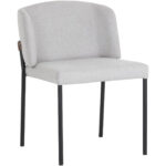 With a clean cut design, this modern dining chair illustrates the beauty of minimalism. Features a two-toned seatback with light grey fabric on the interior, and bravo cognac faux leather straps on the exterior. Completed with a black powder-coated iron frame.