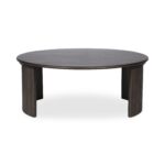 The Penny coffee table’s nesting design showcases a circular tabletop with a refined bullnose edge set upon two curved bases adorned with playful, fluted detailing. These solid oak tables infuse dynamic visual interest with the smaller table designed to nest perfectly under the larger one–a harmonious blend of rustic charm and contemporary elegance.