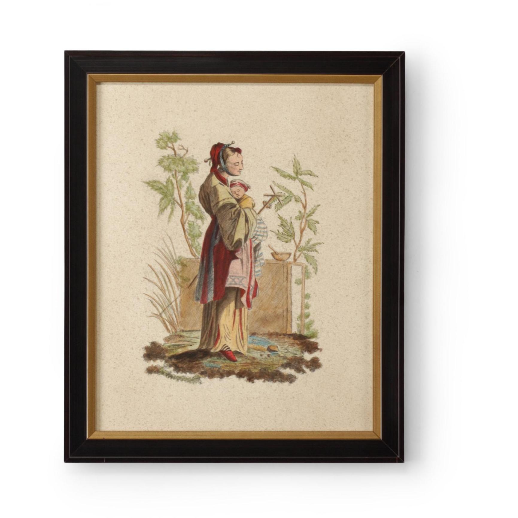 Watercolor on paper, brown & antique gold frame with glass. Hand painted.
