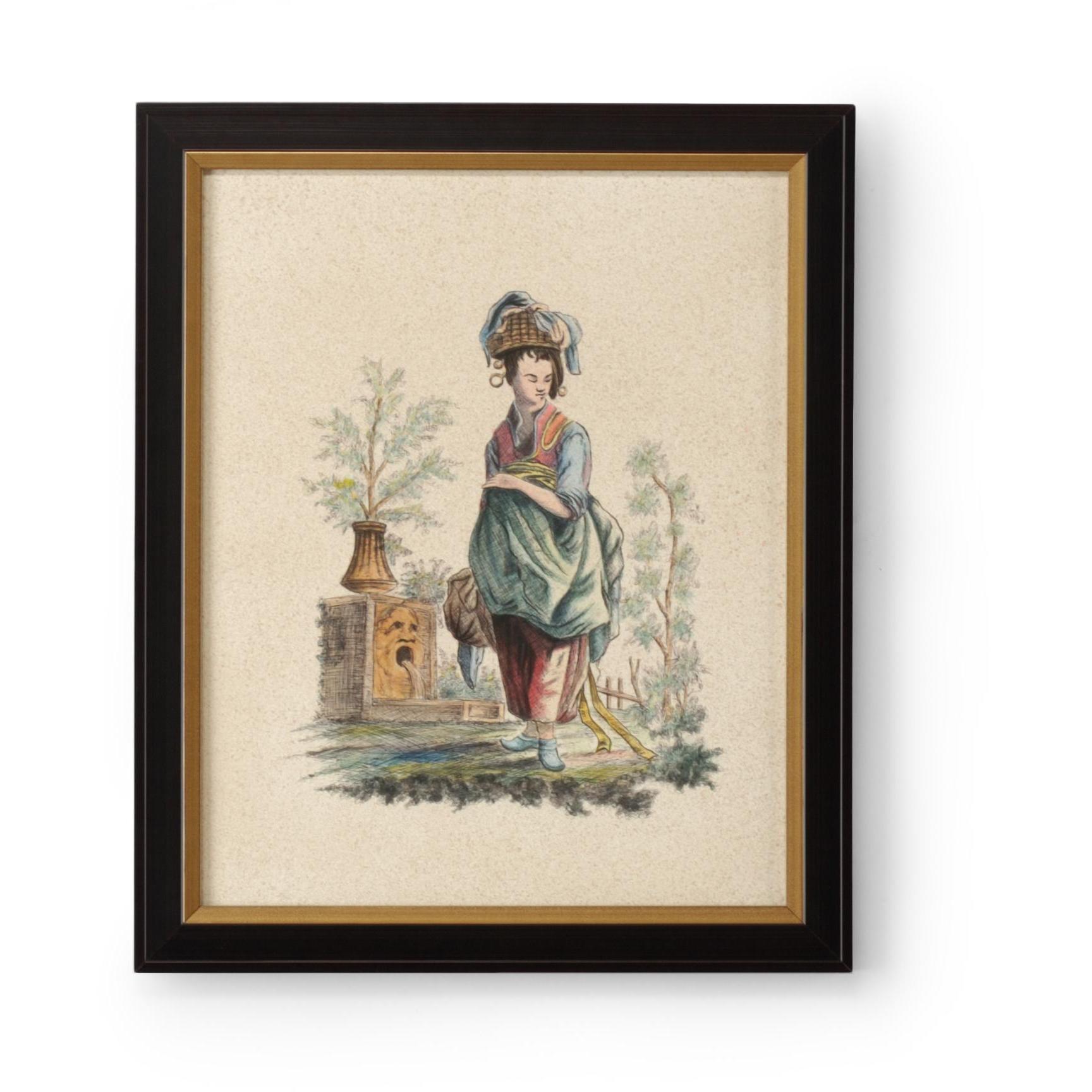 Watercolor on paper,brown and antique gold frame with glass. Hand painted.