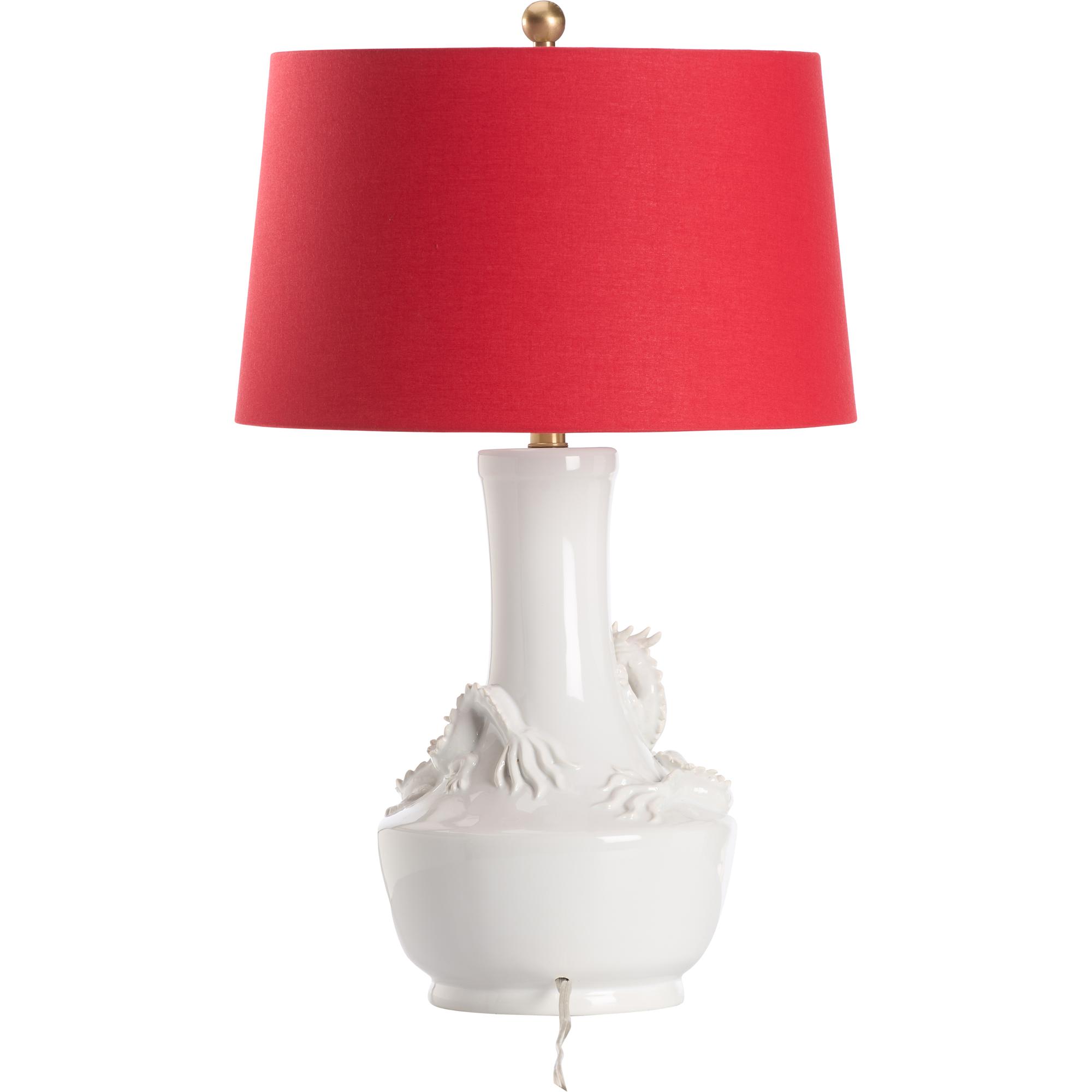 Illuminate your space with the elegant Pinyin Table Lamp, a statement piece that blends artistry and tradition. Crafted from fine ceramic, this vase-shaped lamp features a smooth white glaze and a sculptural dragon gracefully draped around the back, reminiscent of fine jewelry detailing. Topped with a rich red lampshade, it radiates warmth and cultural sophistication—perfect for adding a touch of luxury and symbolism to modern or classic interiors.