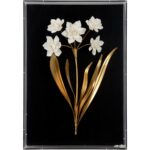 Bring a whimsical and wild touch to your walls with Porcelain Flowers. Leaves are crafted with antique gold leaf over iron. Flowers are handmade matte white porcelain mounted on a black linen background in an acrylic shadow box frame. Perfect by itself or in a group. Four in the series. Designed by Bill Cain.