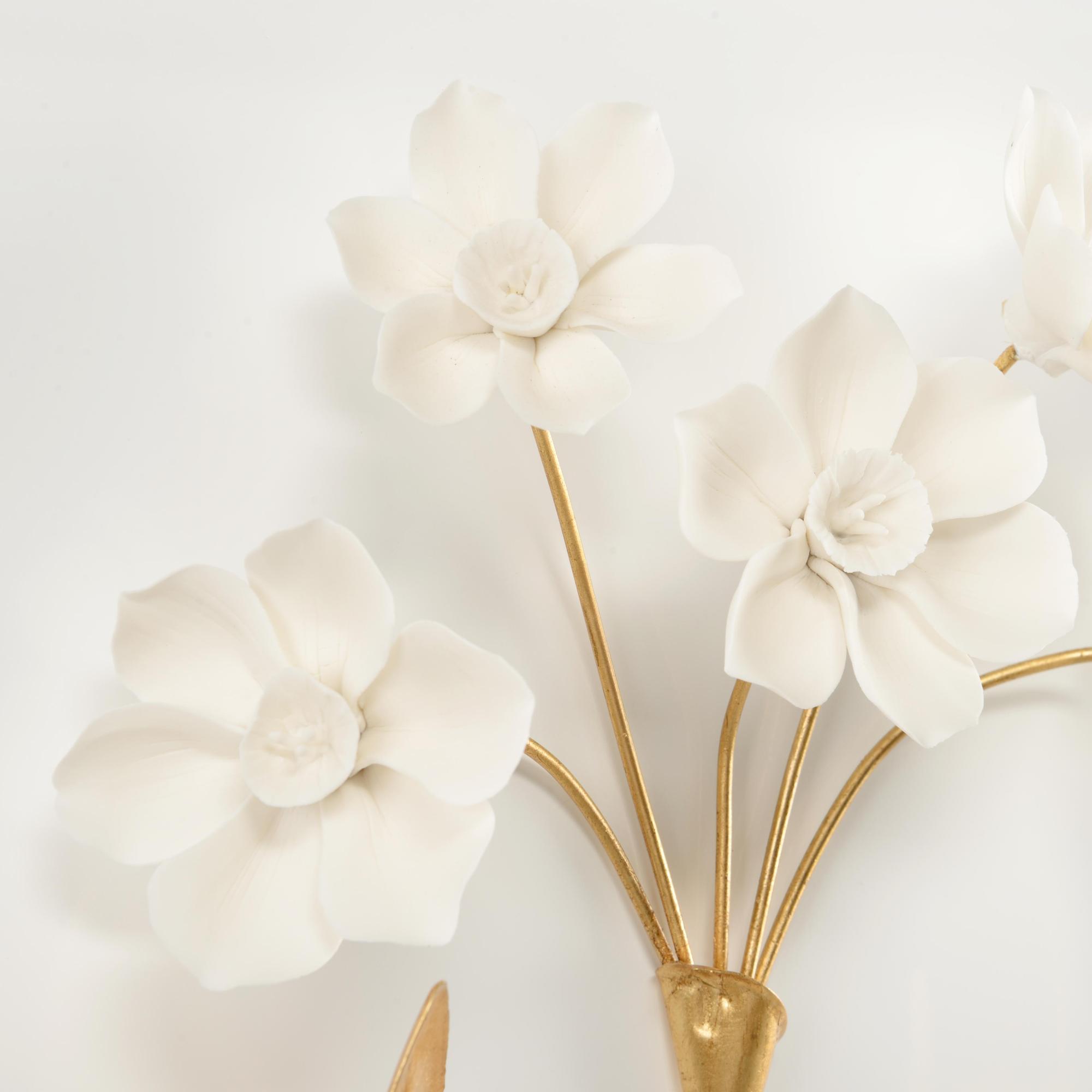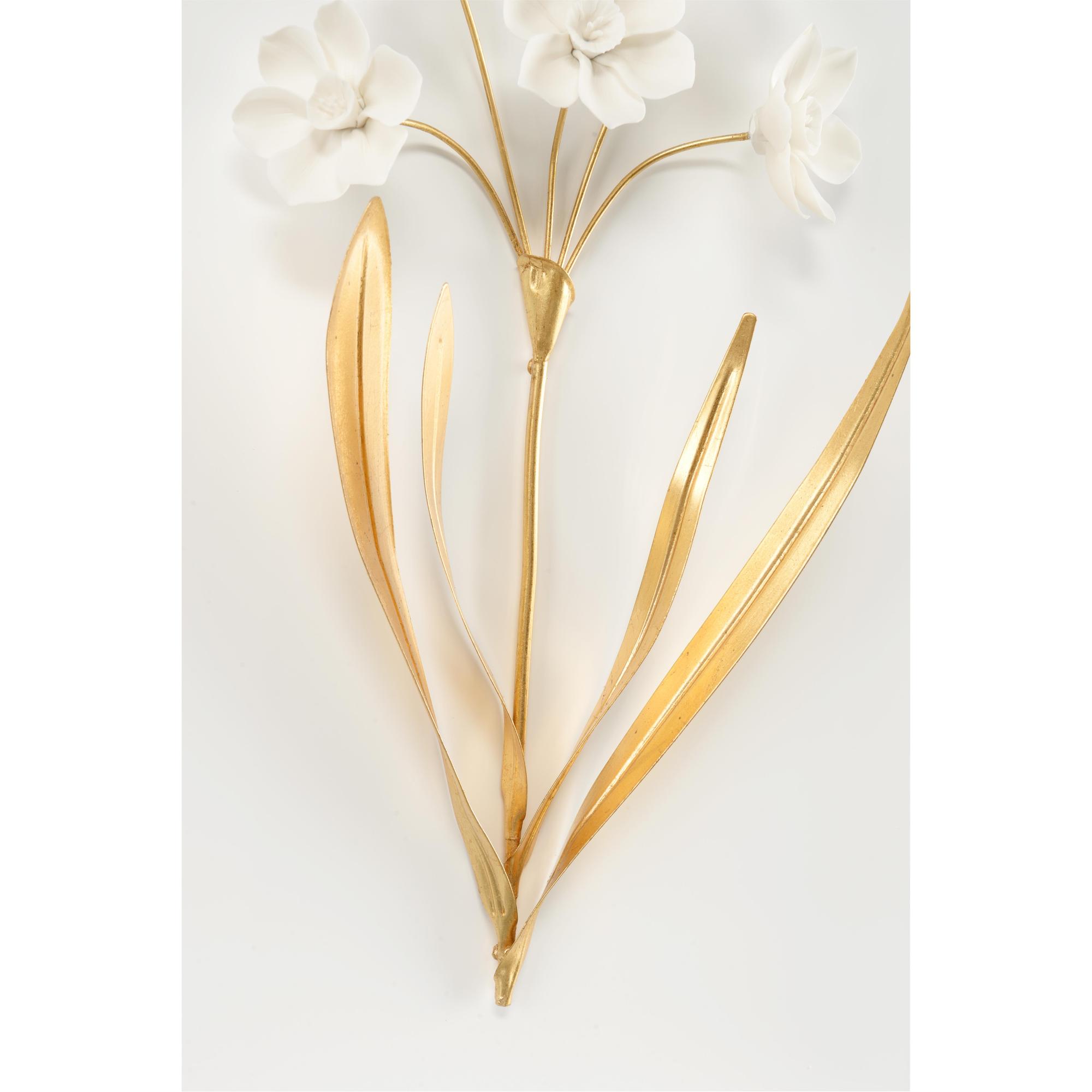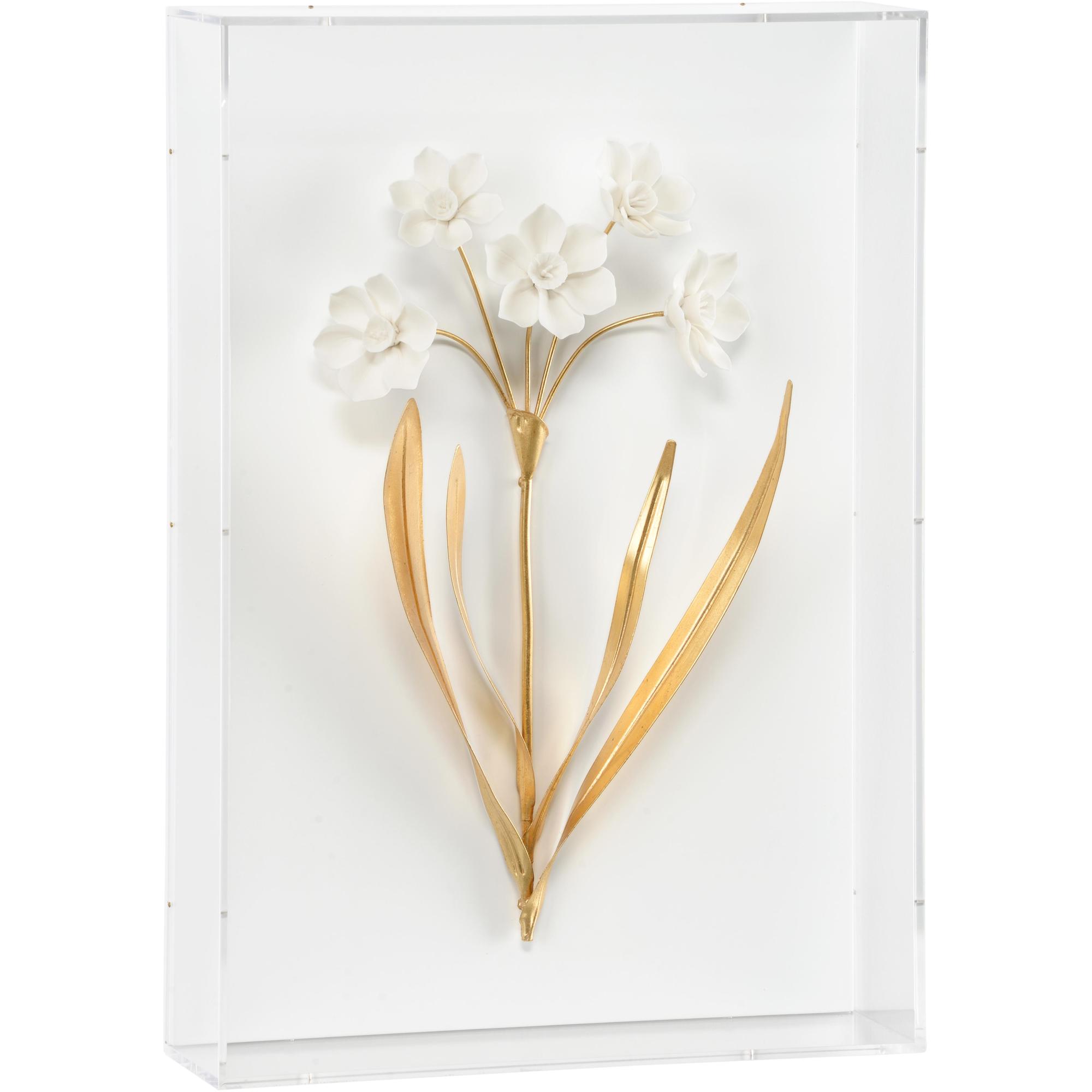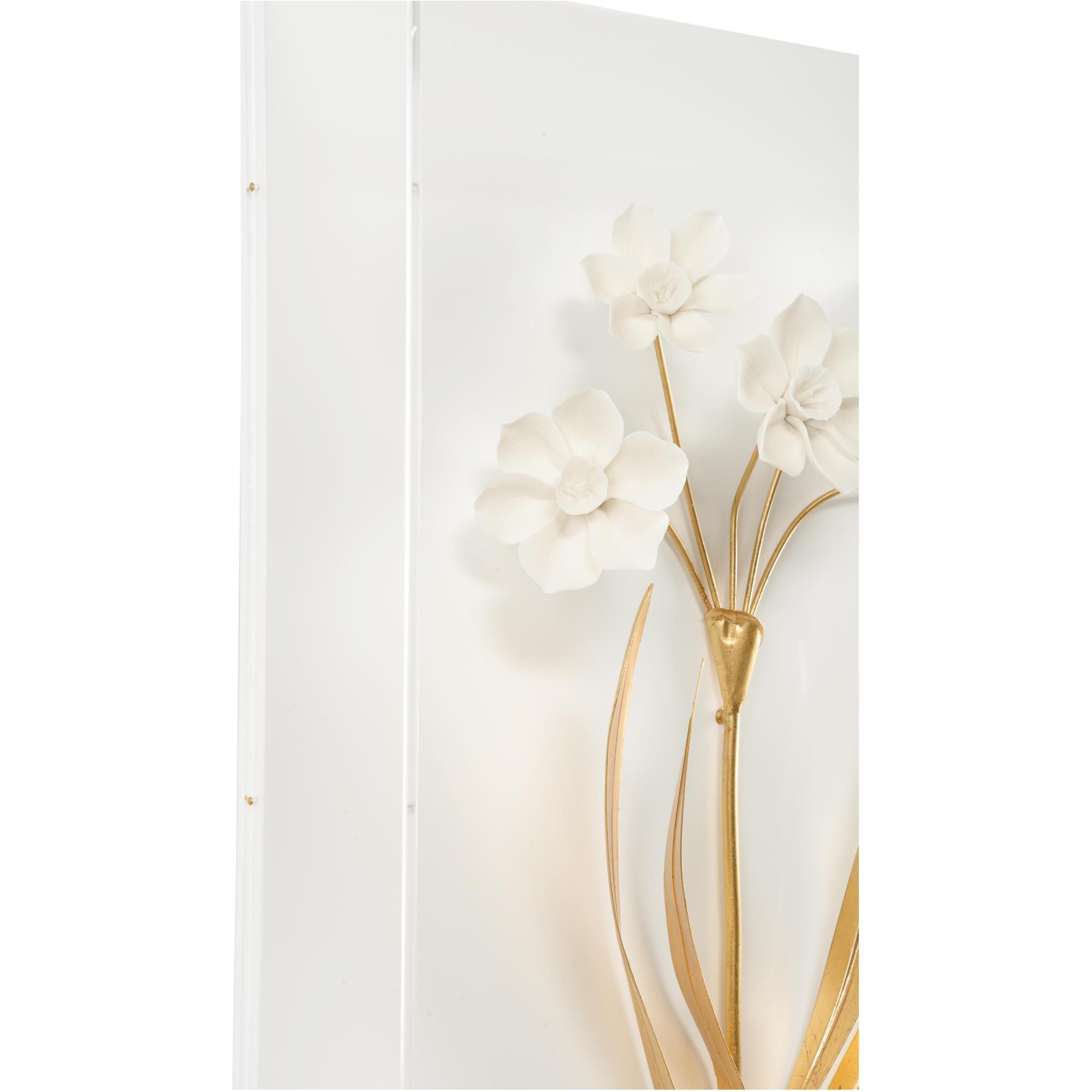 Bring a whimsical and wild touch to your walls with Porcelain Flowers. Leaves are crafted with antique gold leaf over iron. Flowers are handmade matte white porcelain. Flowers are mounted on a white linen background in an acrylic shadow box frame. Perfect by itself or in a group. Four in the series. Designed by Bill Cain.