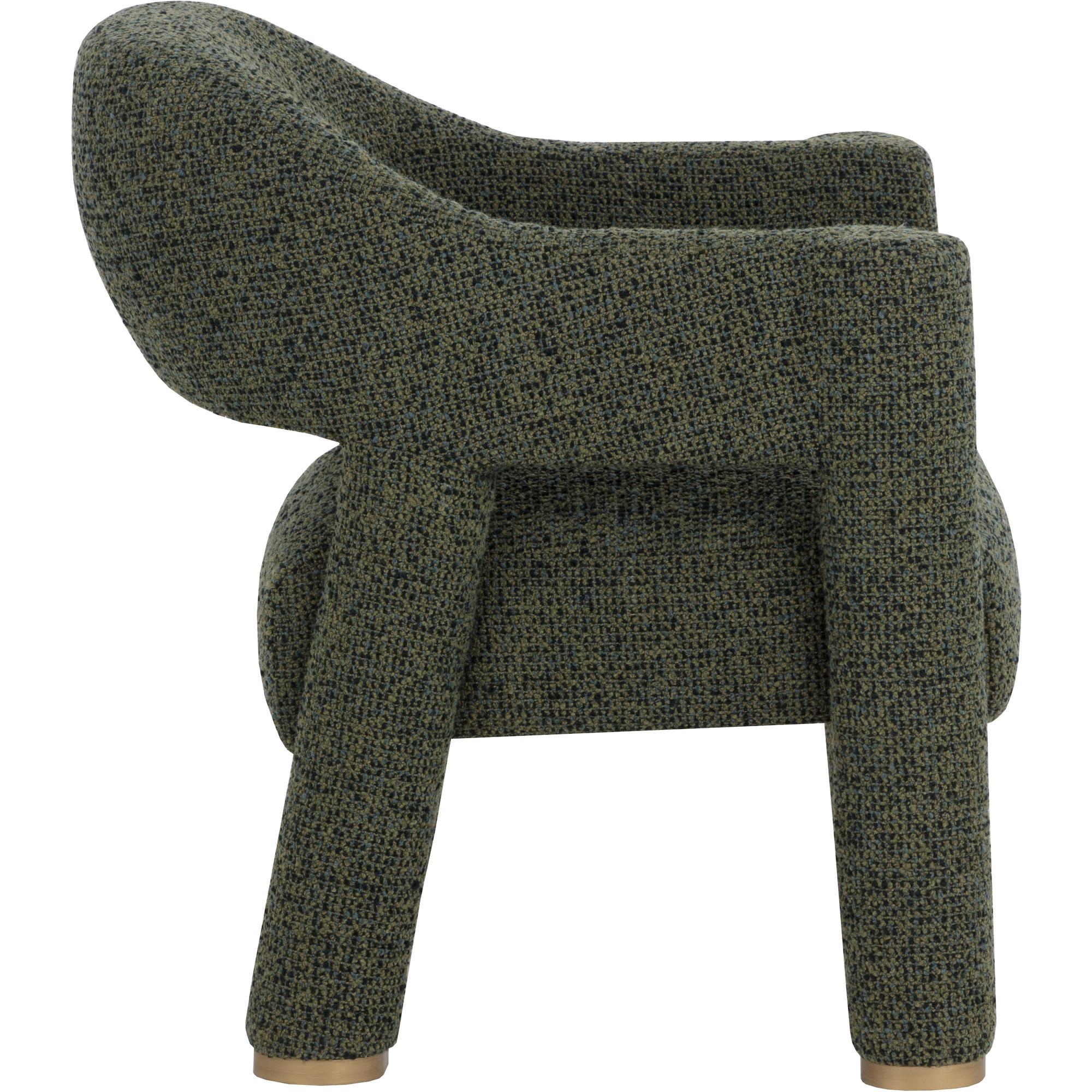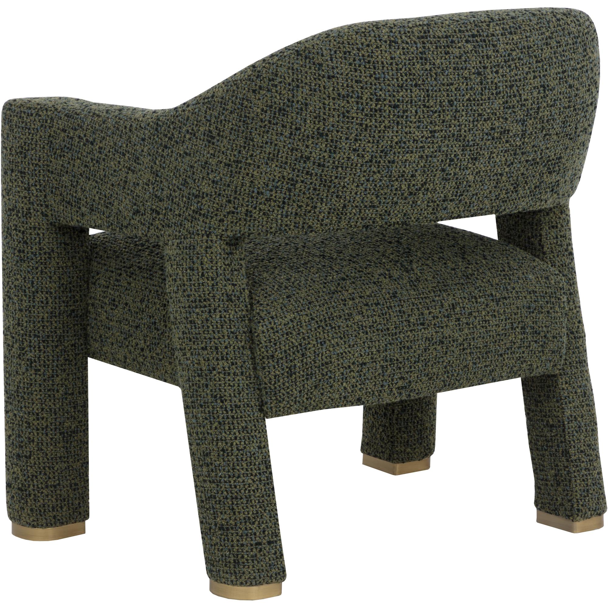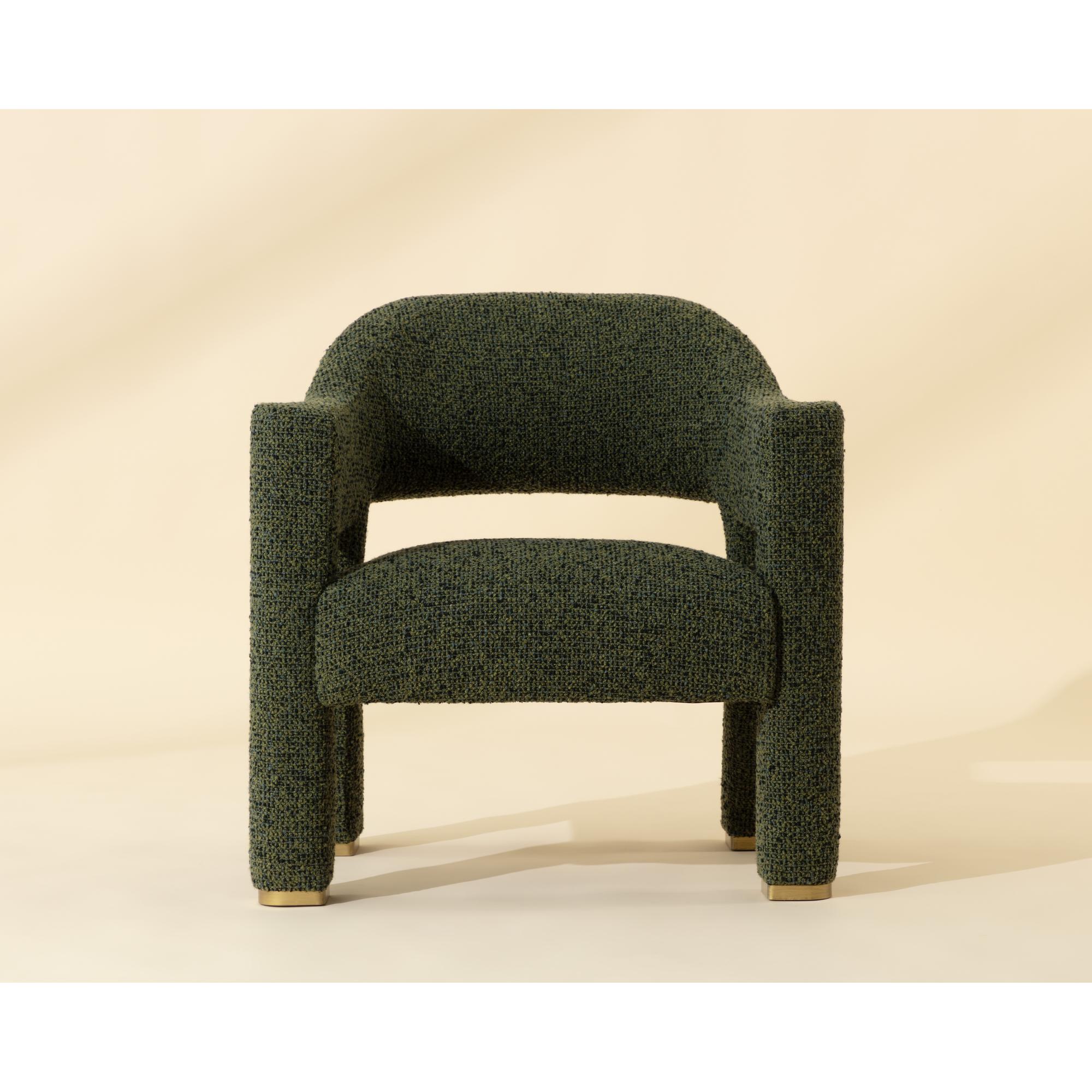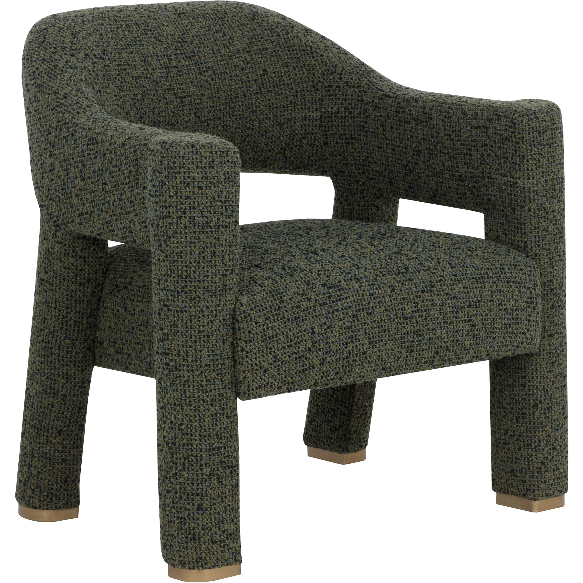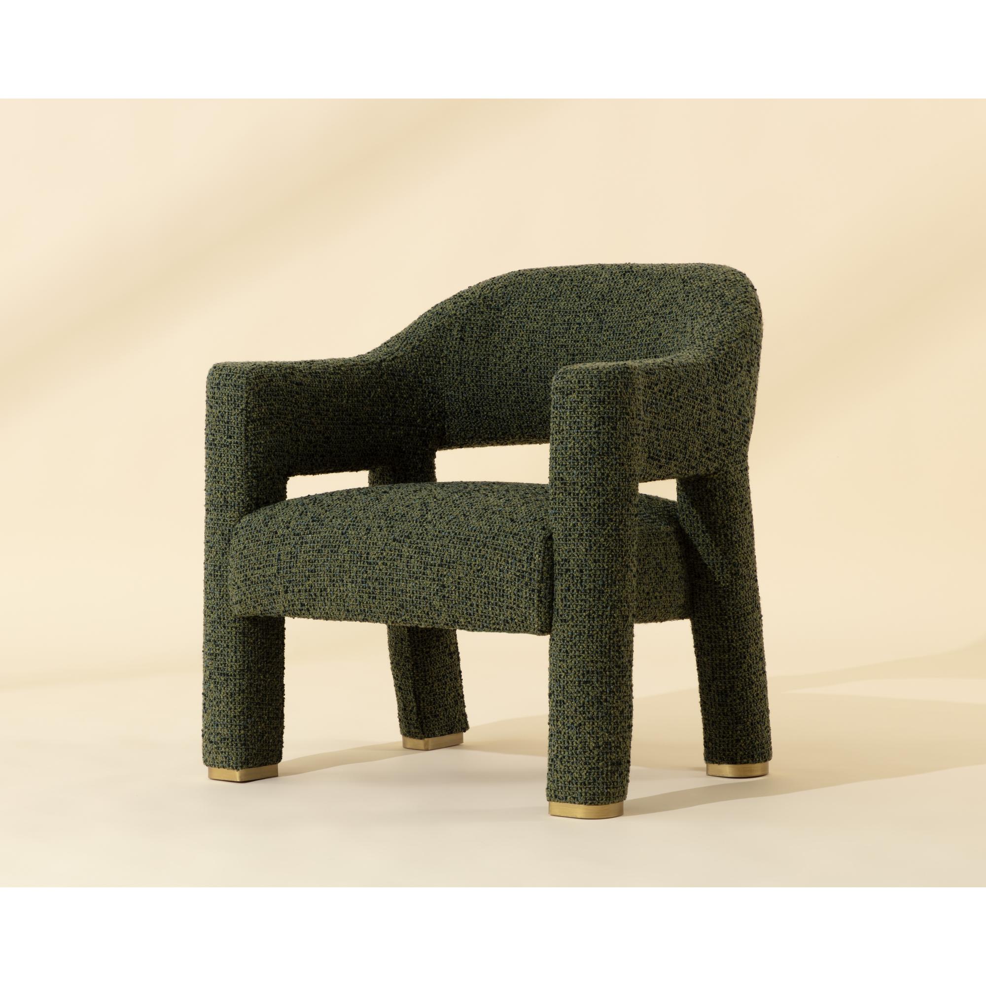The Prisca Lounge Chair leans into its exaggerated proportions, with curves and lines that accentuate its rich texture. The cutout back adds lightness to the form, while brushed brass feet add just enough shine to catch the light. Designed to make a statement from every angle.
