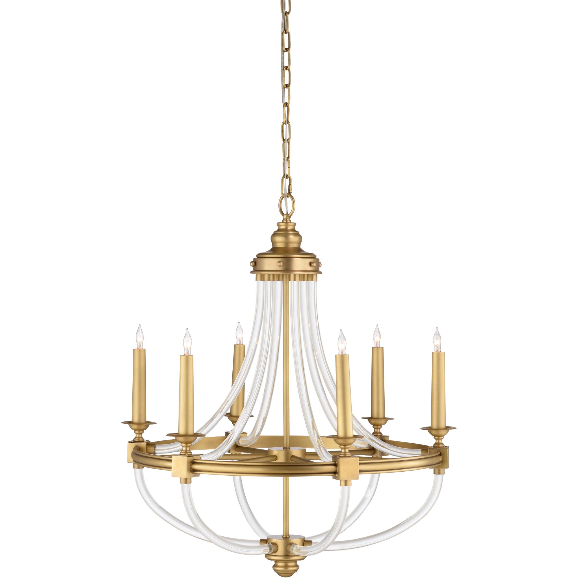 Antique brass, 6 light chandelier with clear acrylic curved rod details. Comes with 6 feet of chain.