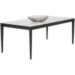 This mid-century modern dining table features clean lines with a sturdy silhouette. Designed with a white ceramic top featuring grey veining designed to mimic the variations and patterns of marble, making each piece unique. Solid brown rubberwood legs complete this design. As wood is an organic, porous material, these pieces will contain natural variation of texture and may also exhibit fine indentations and cracks. Wood pieces will also display a disparity of colour and grain, and visible knots and burls that add to the character of each piece.