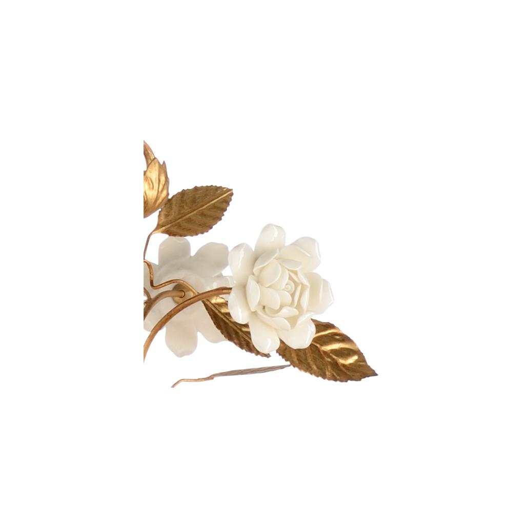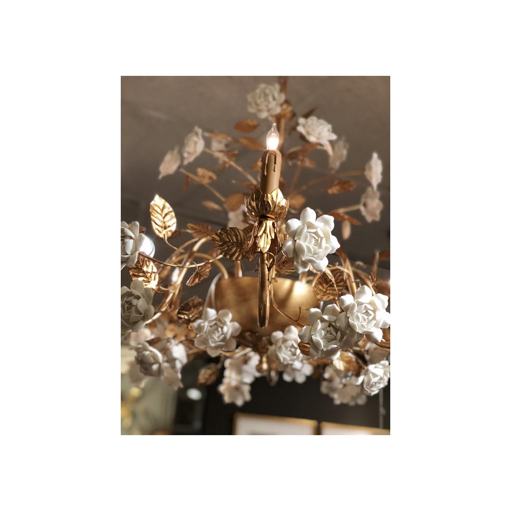 Antique gold leafed iron with white ceramic roses, eight lights