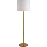 The understated silhouette of this modern floor lamp is simple, yet subtly chic. The modest lines of the lamp base boast a slim iron stem centered by a circular metal stand. Topped with a clean white cotton drum lampshade, the decorative light fixture is plated with an antique brass finish that adds a glamorous element to everyday furnishings.