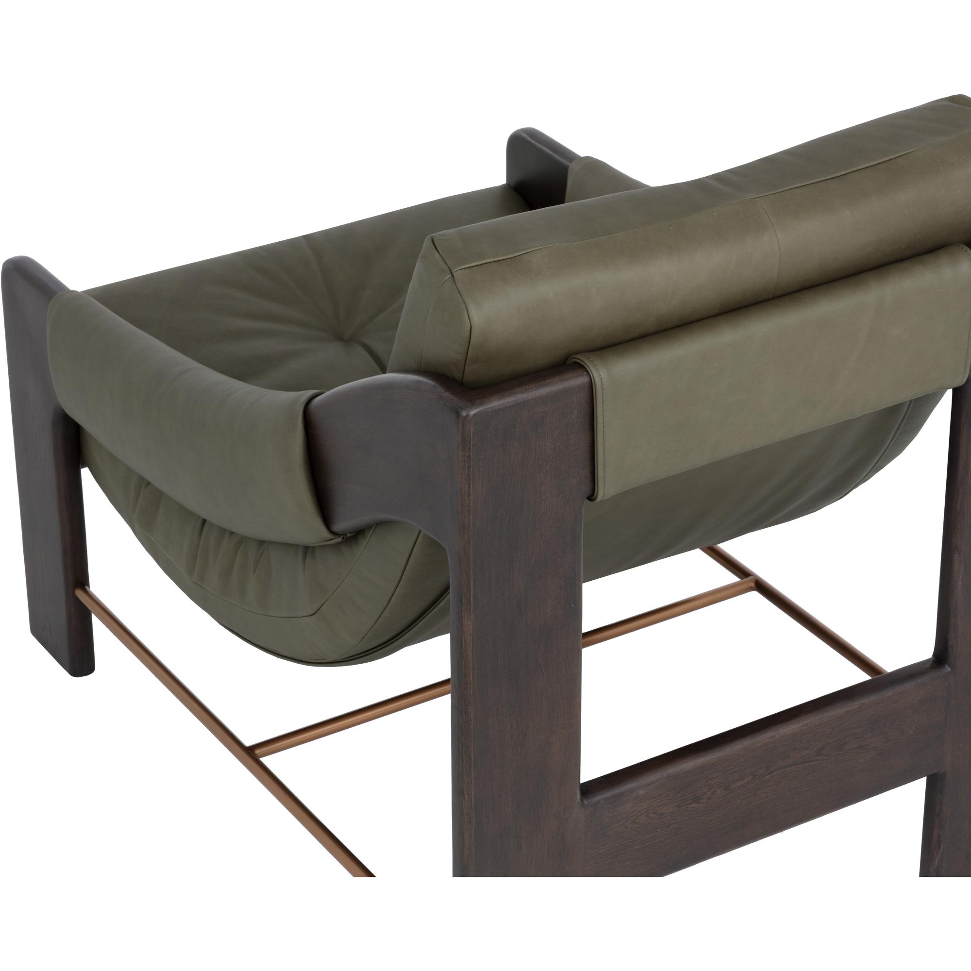 The Rafferty Lounge Chair is designed for unwinding. Draped in smooth ludlow dark olive leather, the reclined sling seat curves with gentle tufting that invites you to sink in. A solid oak wood frame provides structure, balanced by brushed gold steel stretchers below. Whether tucked into a quiet reading nook or placed beside a window, Rafferty becomes a natural companion for moments of pause.