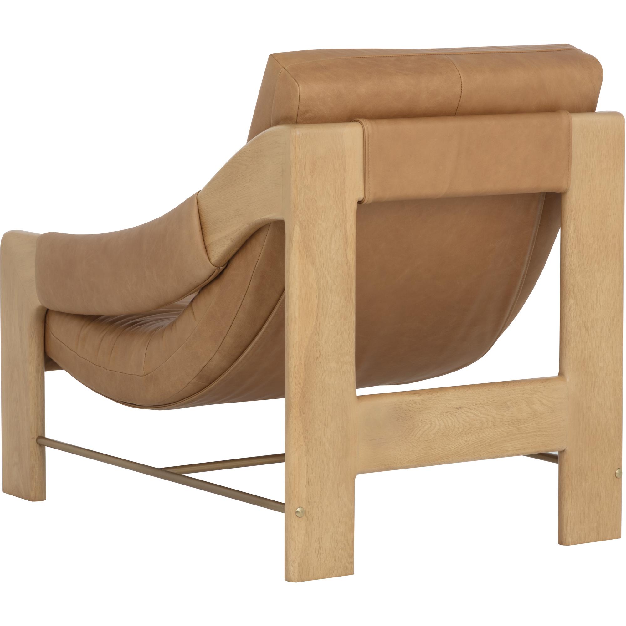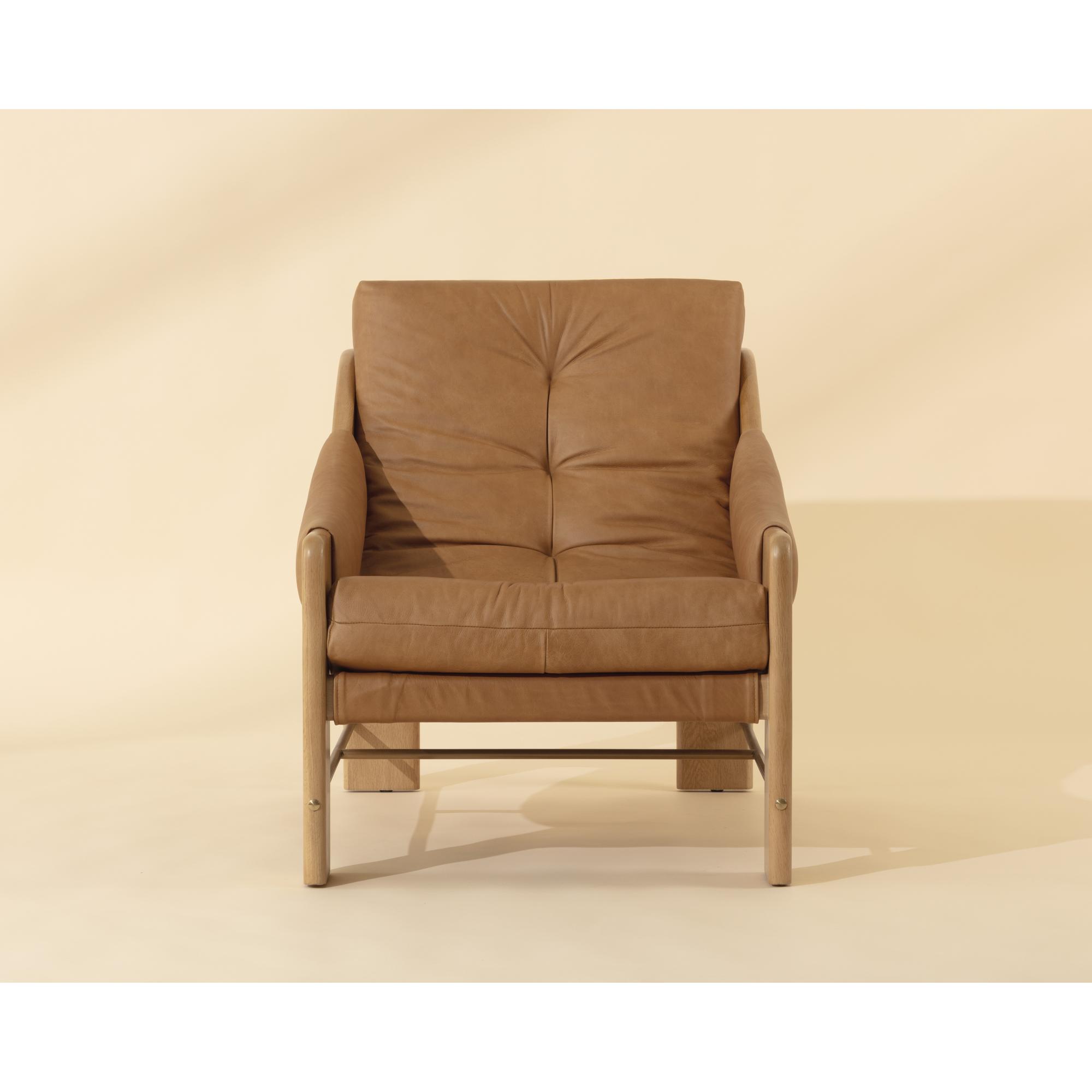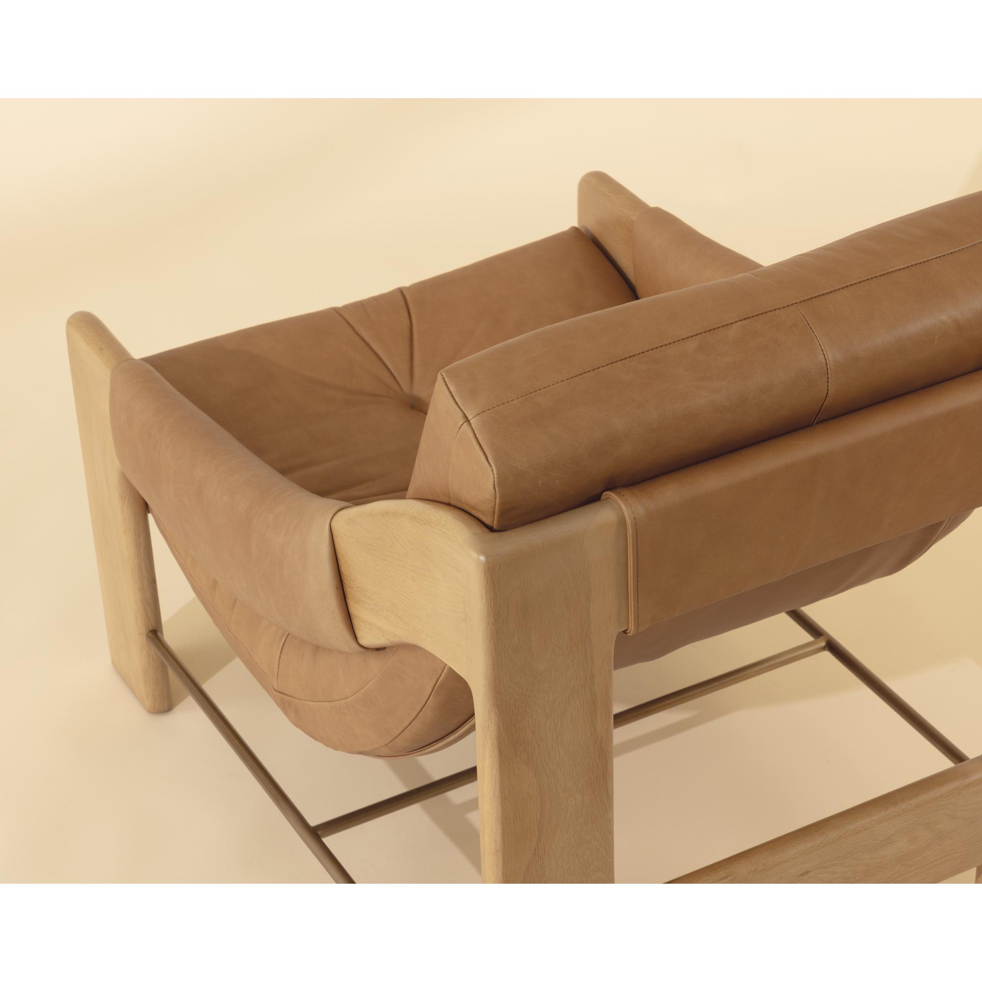 The Rafferty Lounge Chair is designed for unwinding. Draped in smooth ludlow sesame leather, the reclined sling seat curves with gentle tufting that invites you to sink in. A solid oak wood frame provides structure, balanced by brushed gold steel stretchers below. Whether tucked into a quiet reading nook or placed beside a window, Rafferty becomes a natural companion for moments of pause.