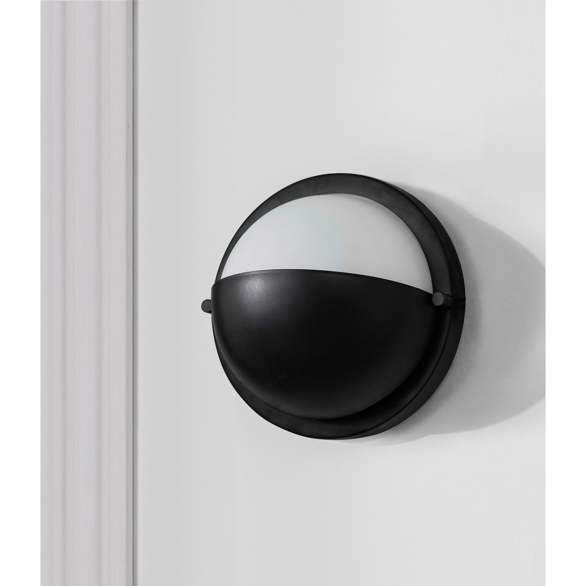 Minimalist details come together to form a striking sconce fit for the modern interior. Painted matte black with a glass etched white globe, its contrasting hues have a bold energy. Eight inches in width and height and four in depth, it is impactful in any space of the home without becoming imposing.