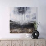 The serene energy of a crisp nature setting at dawn is captured within this canvas painting. An idyllic fit for an interior that is rich in traditional textures and tones, this work of art’s subject matter adds a delicate element to the space. Grand in size, this hand painted canvas is at its best when hanging as a focal point in a room above an entryway or dining table, bed or sofa.