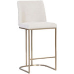 An elegant cantilever counter stool designed with soft, textured belfast oyster shell fabric and an exposed antique brass stainless steel frame.