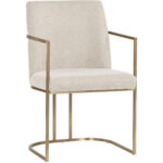 An elegant cantilever dining armchair designed with soft, textured belfast oyster shell fabric and an exposed antique brass stainless steel frame. Can be paired with coordinating dining chair and bench.