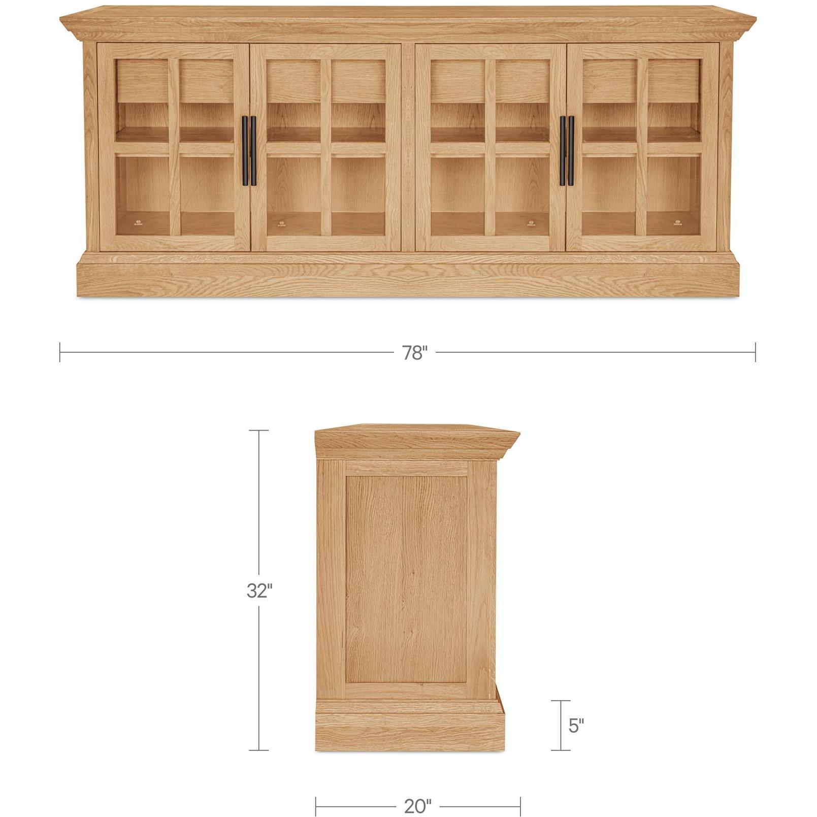Meticulously crafted from solid oak and oak veneer, the Raymond sideboard’s wire-brushed natural finish exudes warmth and texture. The glass front, adorned with traditional molding and a graceful overhang, adds elegance with a contemporary twist. Four drawers and discreet cable management provide practical storage solutions.