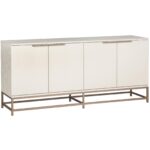 A modern sideboard designed to add a beautiful touch to the living, lounge, office and dining spaces. Crafted from charcoal grey oak veneer with four cabinets and shelves for added storage. Brushed gold iron hardware completes the look. As wood is an organic, porous material, these pieces will contain natural variation of texture and may also exhibit fine indentations and cracks. Wood pieces will also display a disparity of colour and grain, and visible knots and burls that add to the character of each piece.