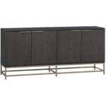 A modern sideboard designed to add a beautiful touch to the living, lounge, office and dining spaces. Crafted from charcoal grey oak veneer with four cabinets and shelves for added storage. Brushed gold iron hardware completes the look. As wood is an organic, porous material, these pieces will contain natural variation of texture and may also exhibit fine indentations and cracks. Wood pieces will also display a disparity of colour and grain, and visible knots and burls that add to the character of each piece.