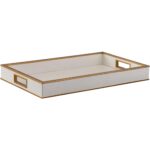 This chic tray features a white faux crocodile finish accented with gold edging, blending bold texture with refined elegance for a sophisticated statement piece. Designed by Shayla Copas.