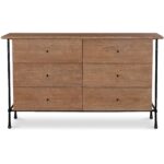 The Rene 6-drawer dresser harmoniously blends traditional charm with contemporary elegance through its beveled feet and mixed material construction. Crafted from solid Acacia wood, its wire-brushed finish reveals intricate grain patterns resting atop hammered iron legs, creating a floating effect. Meticulous craftsmanship shines through wood joinery details and contrasting iron handles as six spacious drawers offer ample storage.