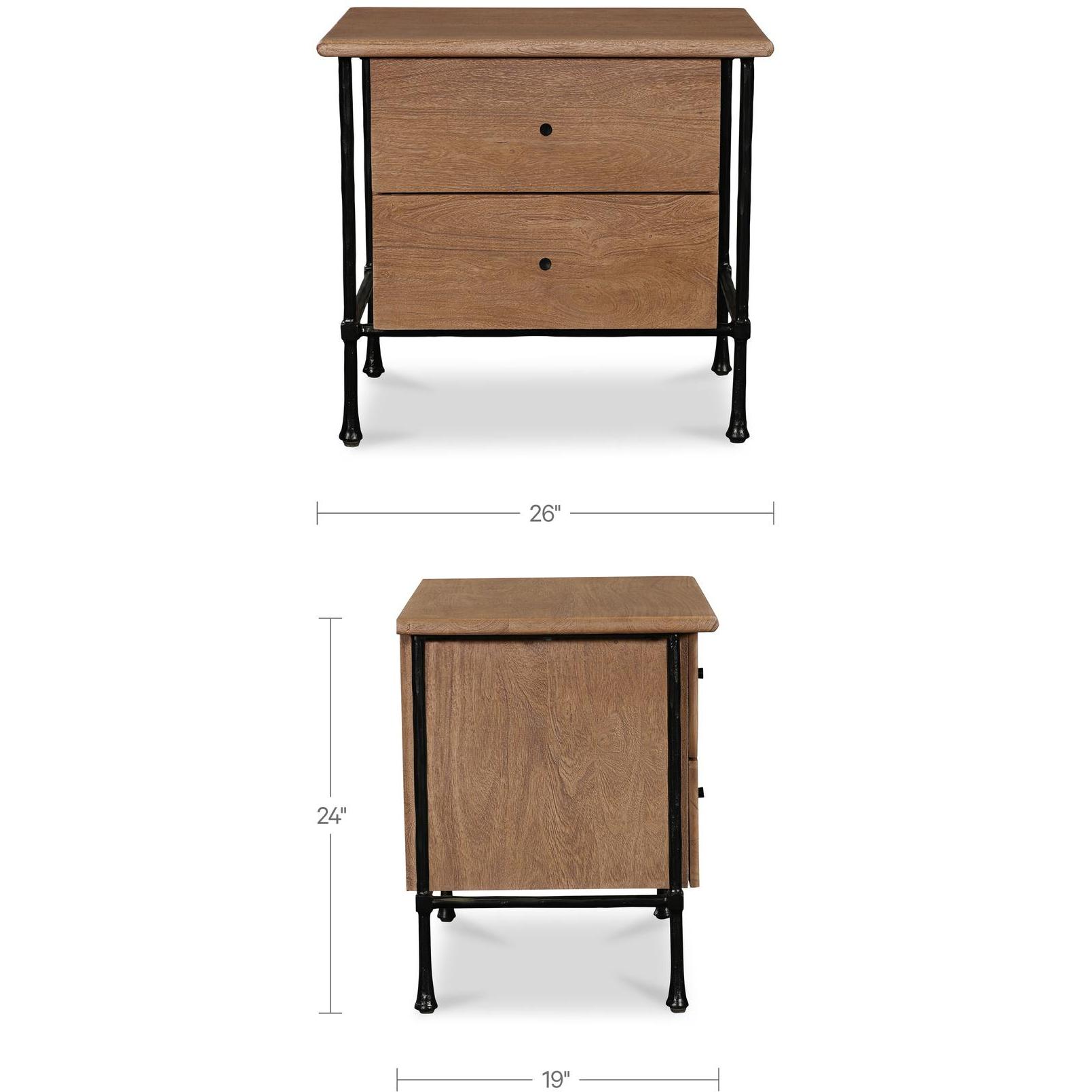 The Rene nightstand harmoniously blends traditional charm with contemporary elegance through its beveled feet and mixed material construction. Crafted from solid Acacia wood, its wire-brushed finish reveals intricate grain patterns resting atop hammered iron legs, creating a floating effect. Meticulous craftsmanship shines through wood joinery details and contrasting iron handles.