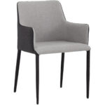 This modern dining armchair offers a minimalist silhouette perfect for small urban settings. Features a comfortable seat in armour grey fabric with a contrasting seat back and steel legs upholstered legs in dark slate fabric.