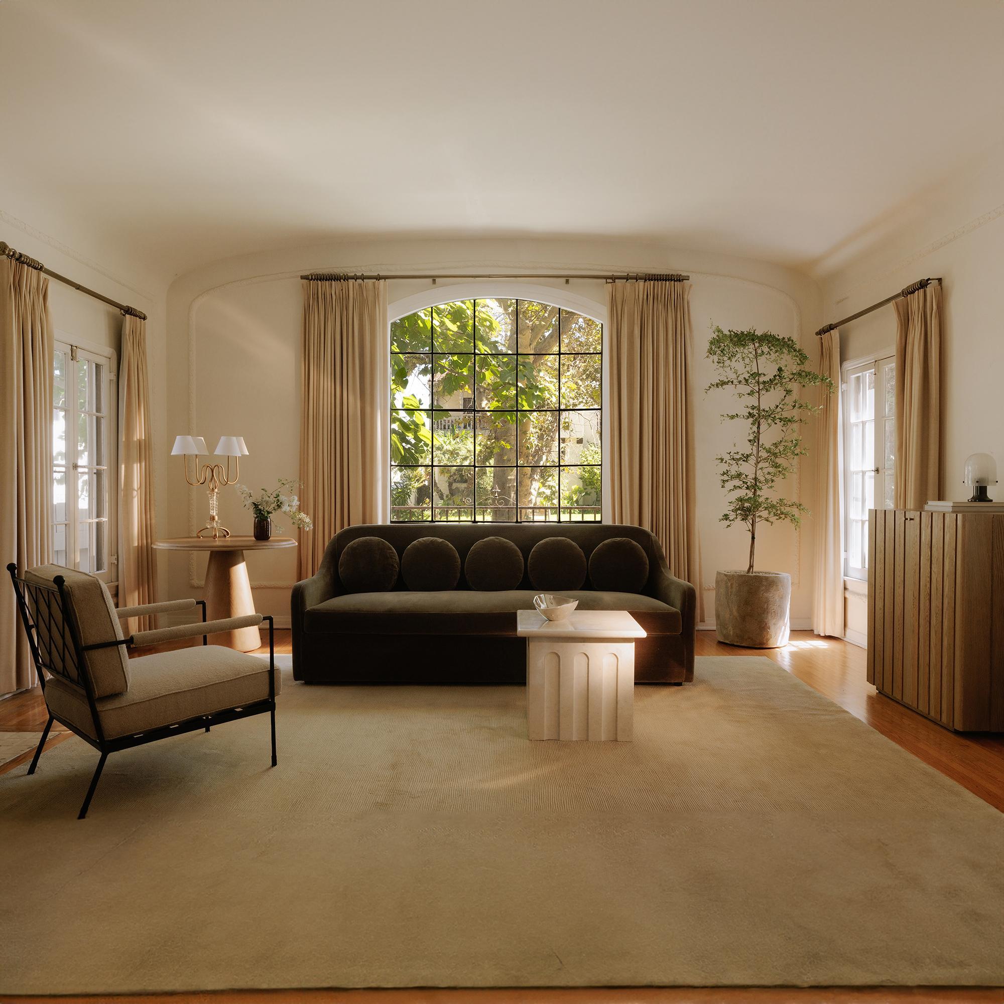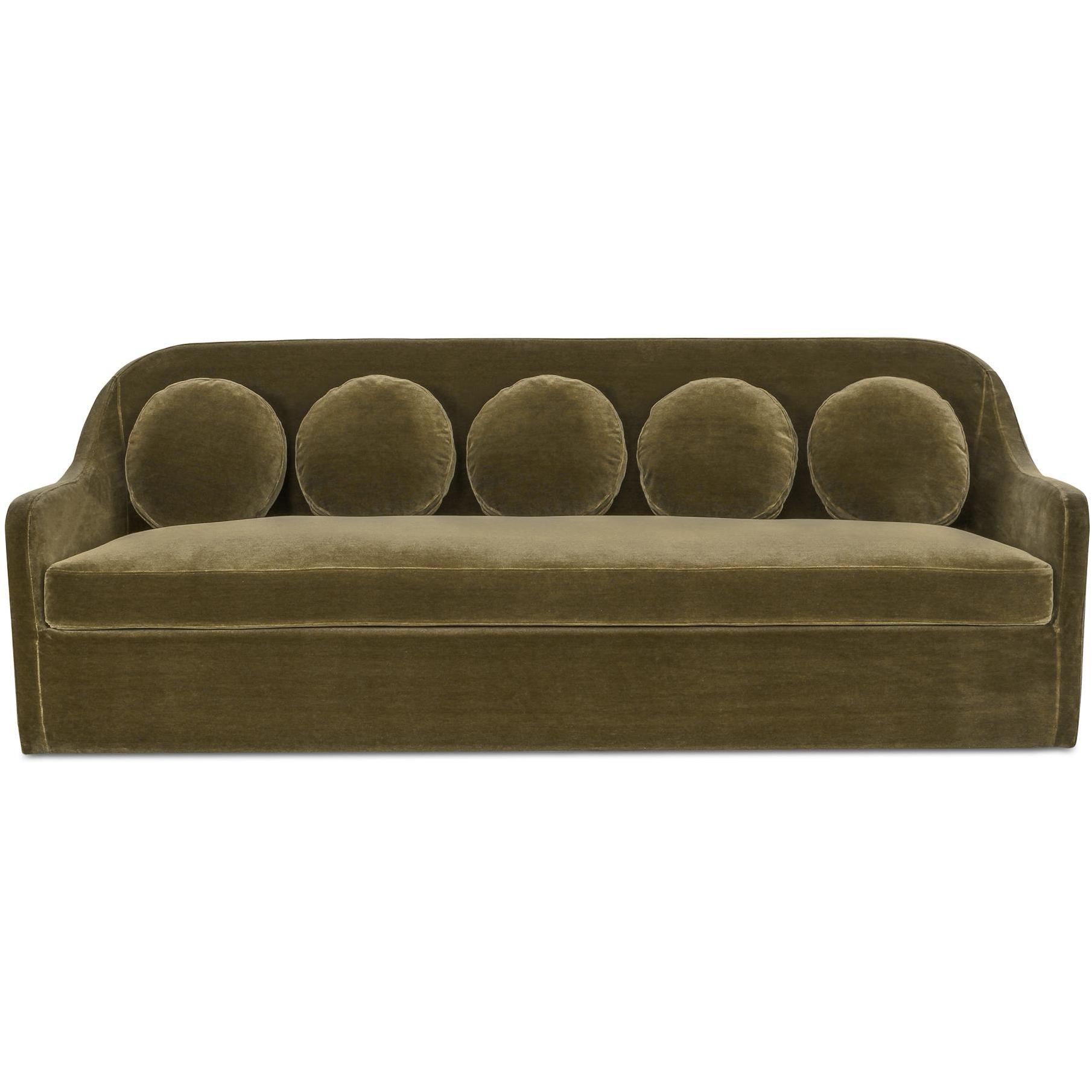 The Rialto sofa straddles the traditional and the contemporary, with mid-century inspiration through five playful, pancake-shaped pillows. An embrace of everyday living proportioned for relaxation, this piece features inviting round forms and durable, forgiving mohair upholstery, balancing playful sophistication and enduring elegance.