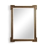 Beveled mirror with a rectangular black and gold wooden frame. Keyhole fasteners are provided for horizontal or vertical hanging.