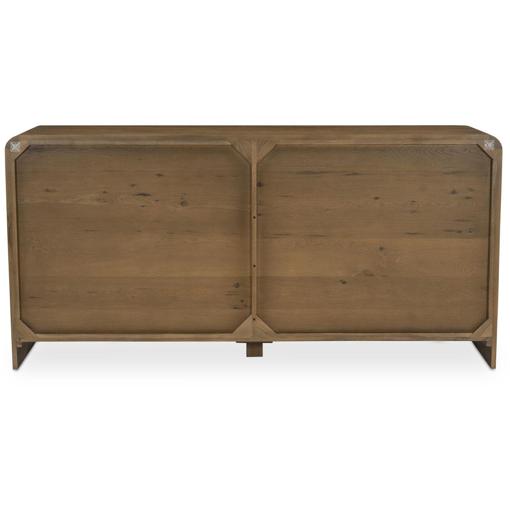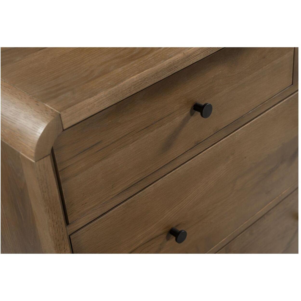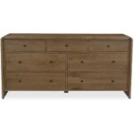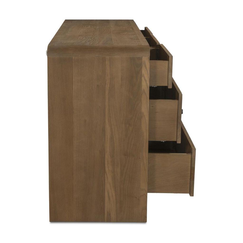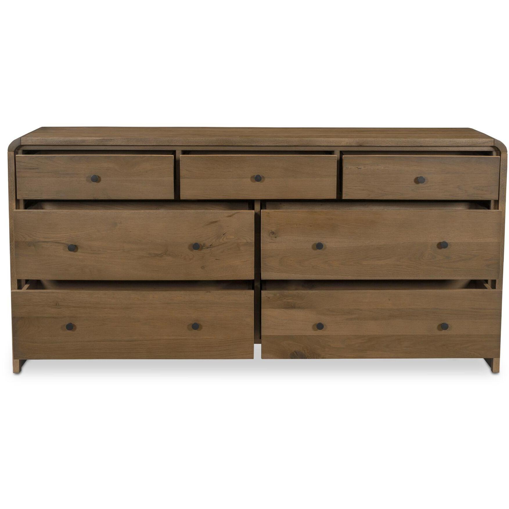 Featuring a unique waterfall edge and overhang detailing, the Riley 7-drawer dresser offers captivating visual interest, underscored by its solid oak construction. The seamless design is a timeless blend of sophistication and practicality, with ample seven-drawer storage.