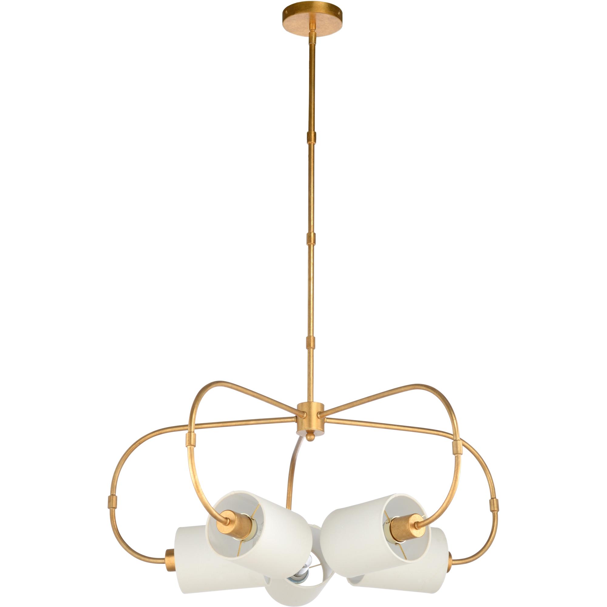 Contemporary gold chandelier with five individual shades. Comes with three 9″ rods making it adjustable from 18″ – 45″. Five lights.