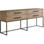 The River Rock Metal Base Console blends industrial chic with natural warmth. Featuring a sleek metal base and a light and airy River Rock finish, its clean lines and four spacious drawers offer both style and functionality. This console adds a modern, architectural touch to your entryway, living room, or dining area, perfect for those seeking a blend of contemporary design and practical storage.