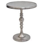 An elegant round table top sits on an ornate carved stem. Made from aluminum, this decorative table features a stunning raw nickel finish.
