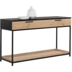A console table that evokes a modern industrial design, making it perfect for living or lounge spaces. Features a black wood frame with drawers in a brown rustic oak veneer. Completed with a matte black iron legs and aluminum handles. Anti tipping kit included. Pairs well with the Rosso media console and cabinet. As wood is an organic, porous material, these pieces will contain natural variation of texture and may also exhibit fine indentations and cracks. Wood pieces will also display a disparity of colour and grain, and visible knots and burls that add to the character of each piece.