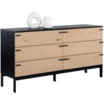 A dresser that evokes a modern industrial design, making it perfect for any bedroom space. Features a black wood frame with drawers in a brown rustic oak veneer. Completed with a matte black iron legs and aluminum handles. Anti tipping kit included. As wood is an organic, porous material, these pieces will contain natural variation of texture and may also exhibit fine indentations and cracks. Wood pieces will also display a disparity of colour and grain, and visible knots and burls that add to the character of each piece.